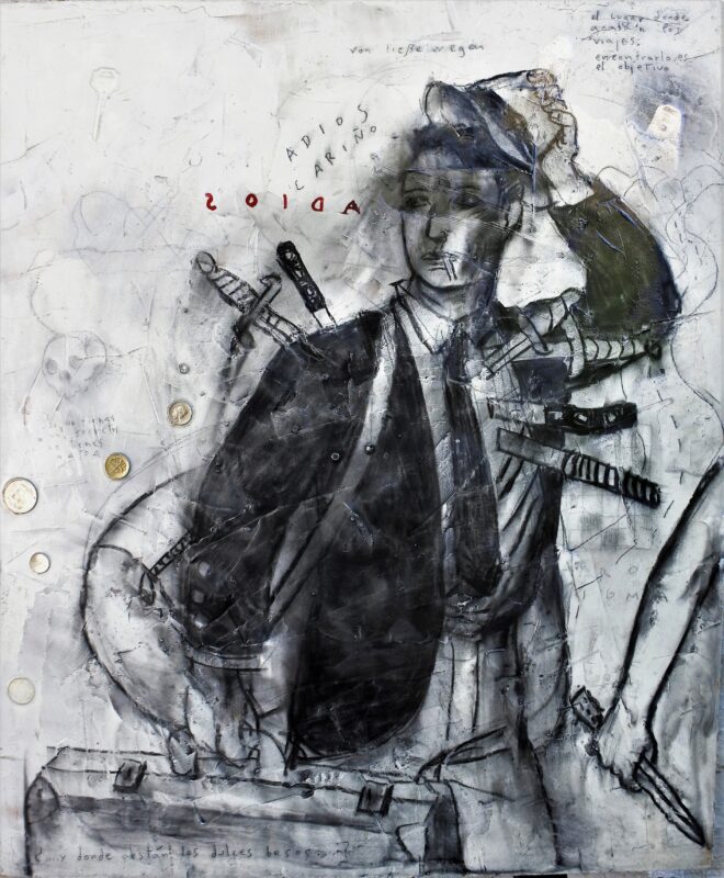 Javier de Juan, Adios cariño, pintura original díptico técnica mixta y collage sobre tabla, dos paneles de 80×67 cms. cada uno