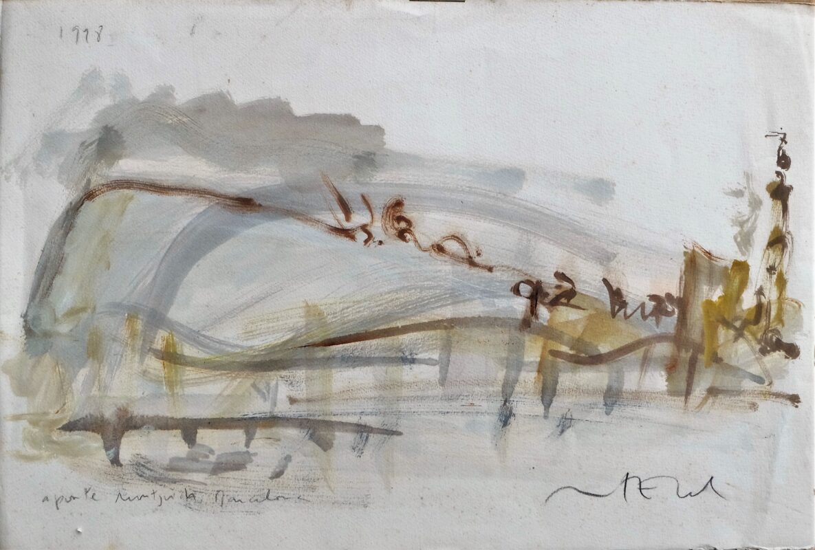Javier Montesol, Barcelona, apunte al natural de Montjuich, dibujo original, pintura acrílico sobre papel, 38×56 cms.
