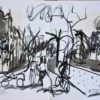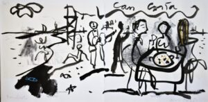 Javier Montesol, Barcelona Can Costa, dibujo original acuarela sobre página de catálogo de grabados de Picasso, 28×55 cms.