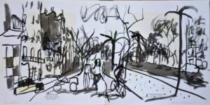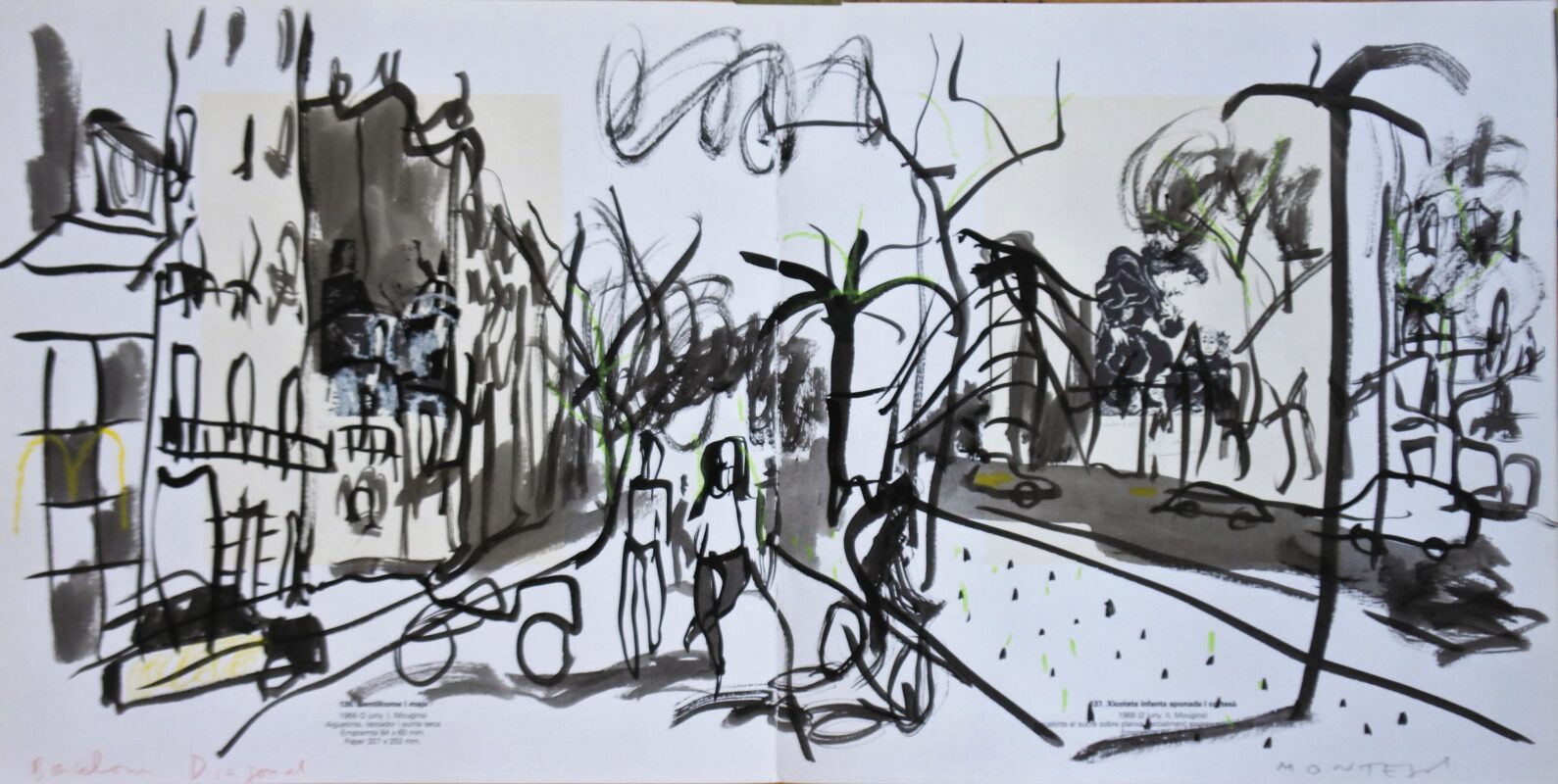 Javier Montesol, Barcelona Diagonal II, dibujo original acuarela sobre página de catálogo de grabados de Picasso, 28×55 cms.