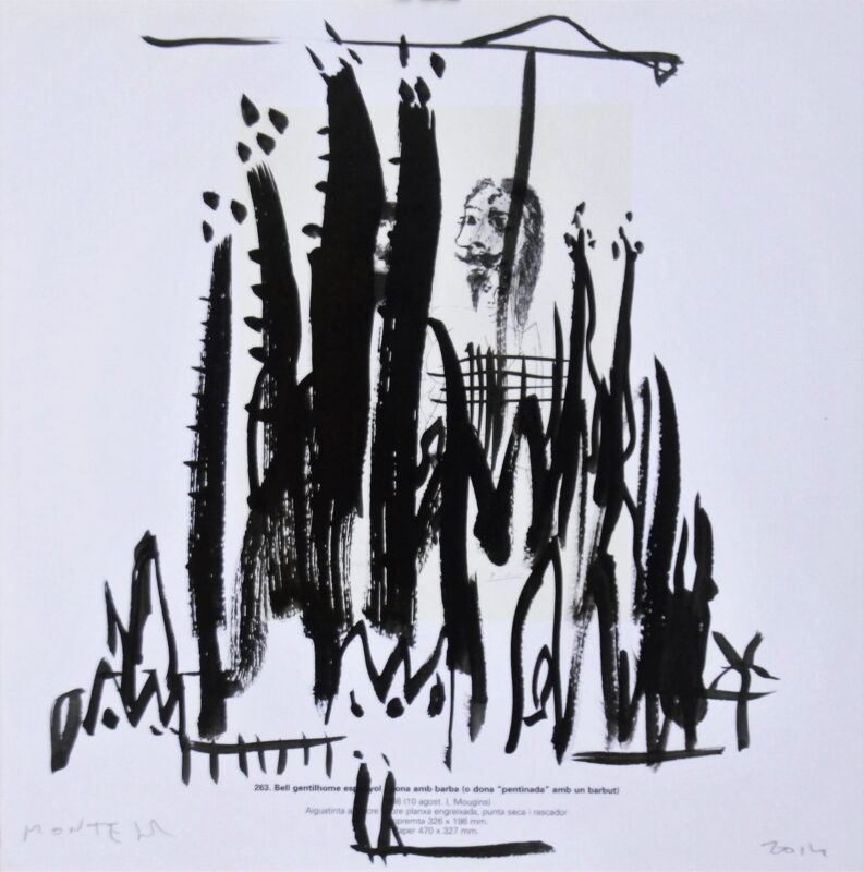 Javier Montesol, Barcelona, Sagrada Familia, dibujo original acuarela sobre página de catálogo de grabados de Picasso, 28×27,50 cms.
