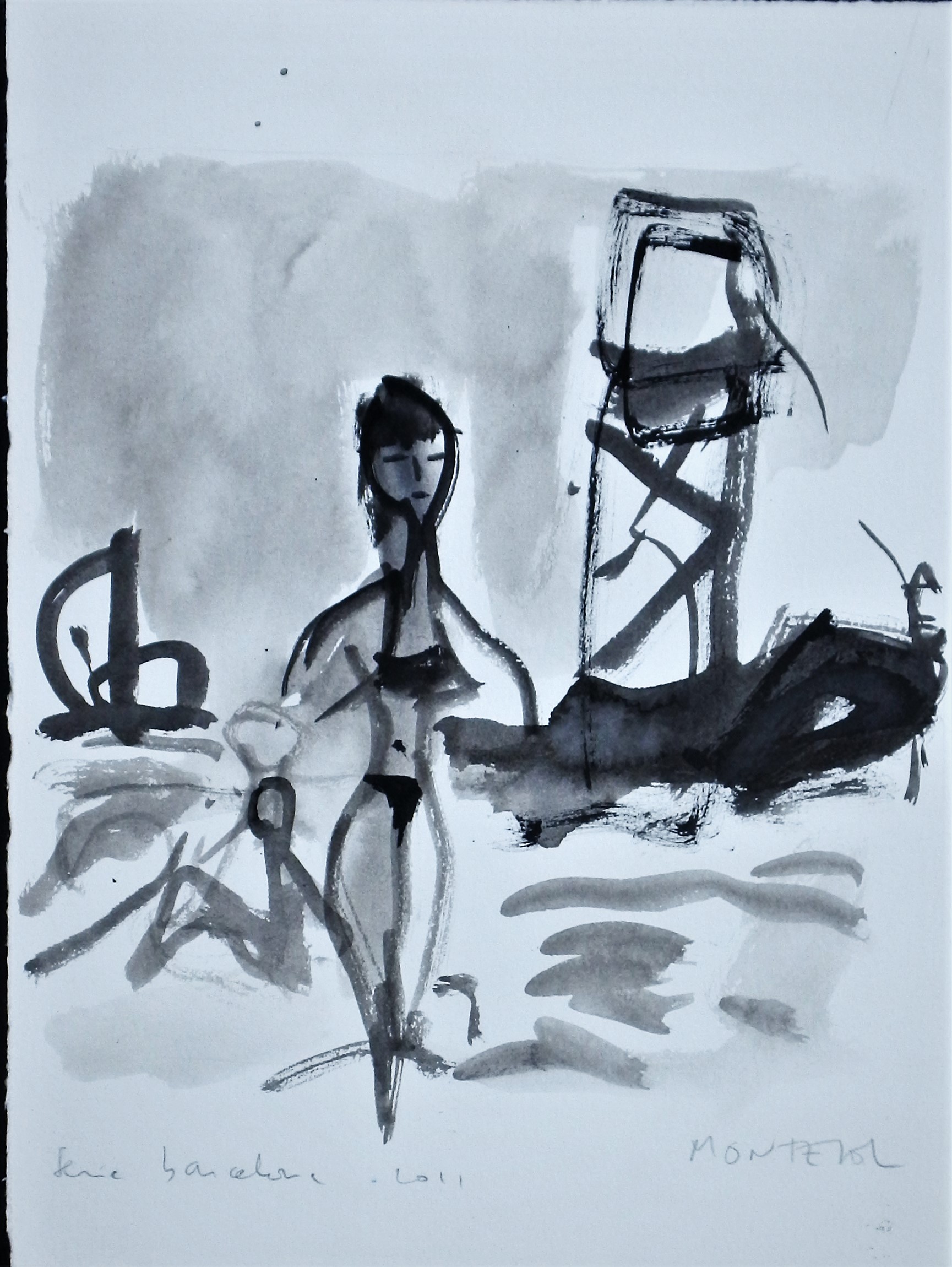 Javier Montesol, En la playa, Barcelona, dibujo original acrílico sobre papel, 28×21 cms.