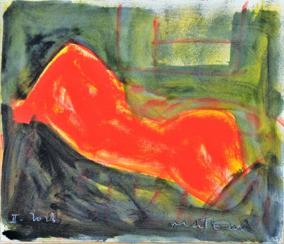 Javier Montesol, Mujer en rojo II, dibujo original oleo cartulina, 35×41,50 cms.420,00