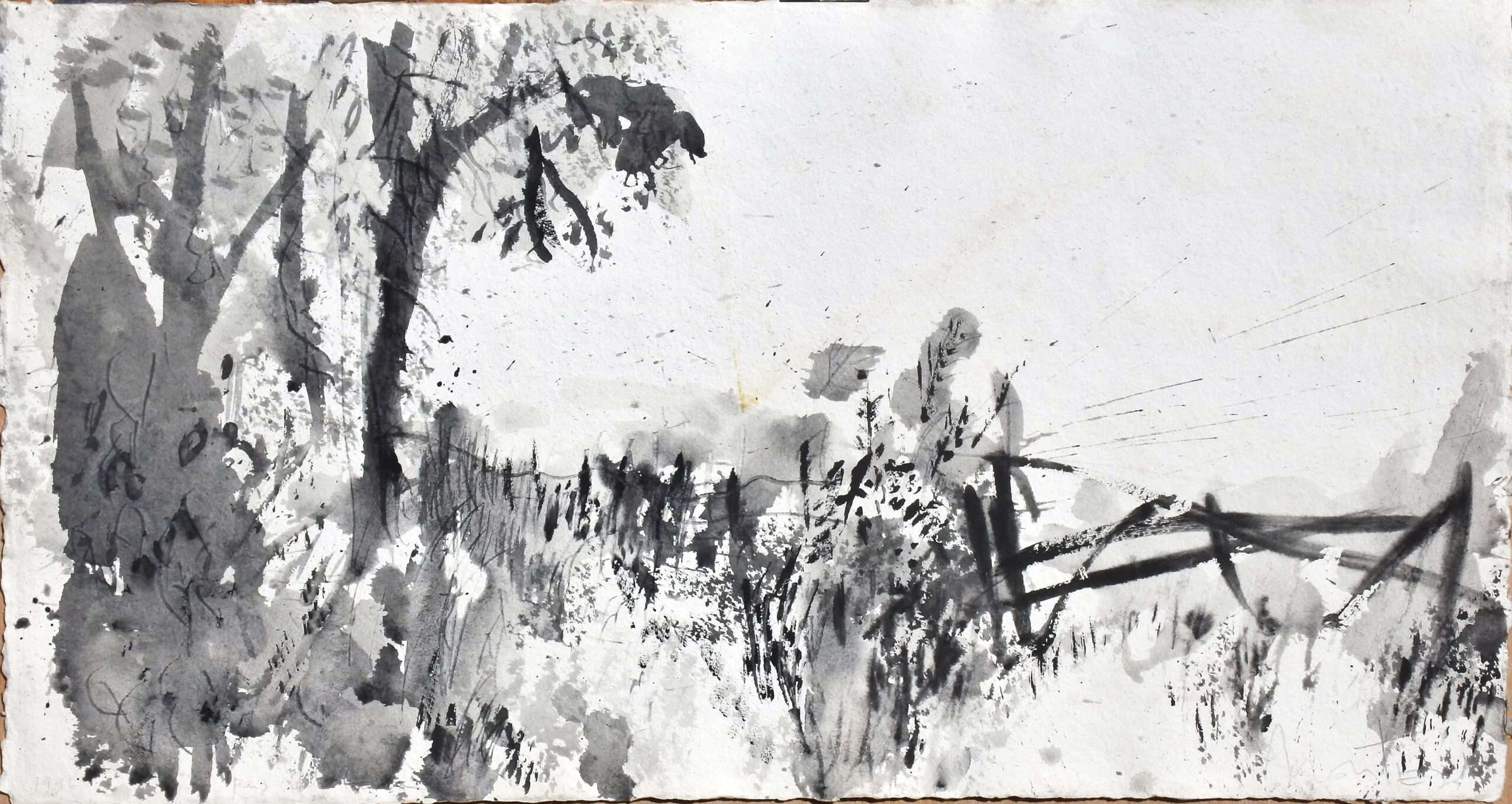 Javier Montesol – «Paisaje del Loira» dibujo acrílico sobre papel artesanal, titulado y datado 1.992 al dorso, y firmado a lápiz