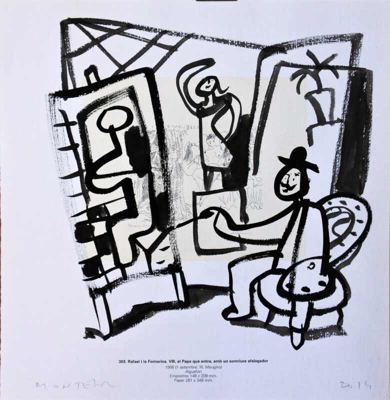 Javier Montesol, Pintor en su estudio, dibujo original acuarela sobre página de catálogo de grabados de Picasso, 28×27,50 cms.