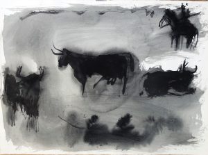 Javier Montesol, Toros en la dehesa, dibujo original acrílico sobre papel, 55×76 cms.