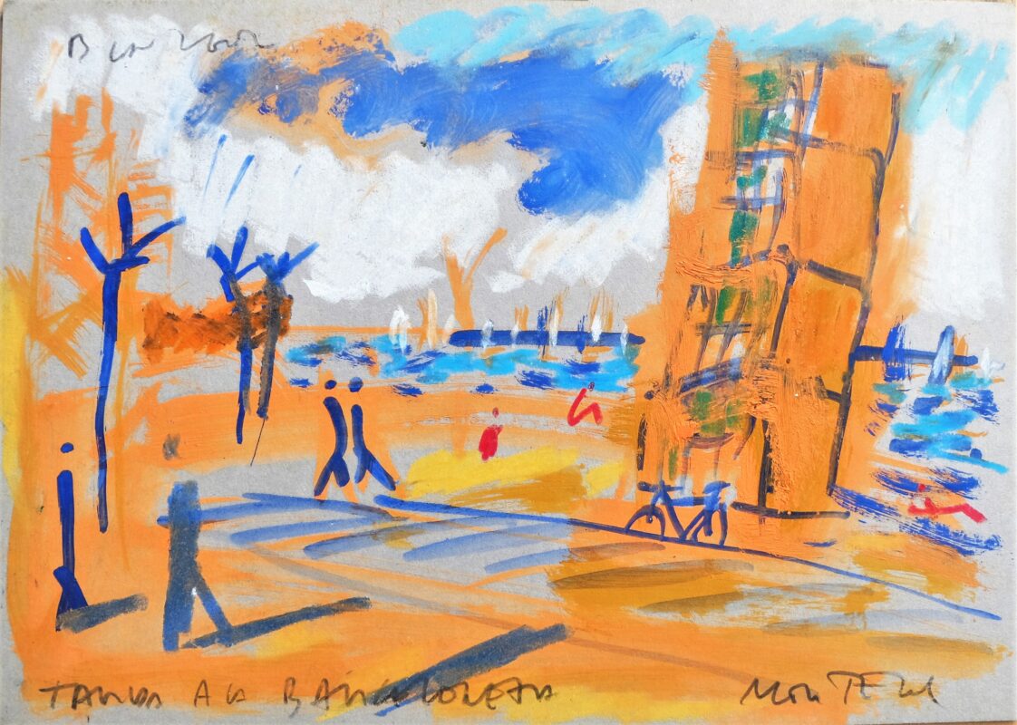 Javier Montesol, Vista de la Barceloneta, dibujo original, técnica mixta sobre cartón, 25×35 cms.