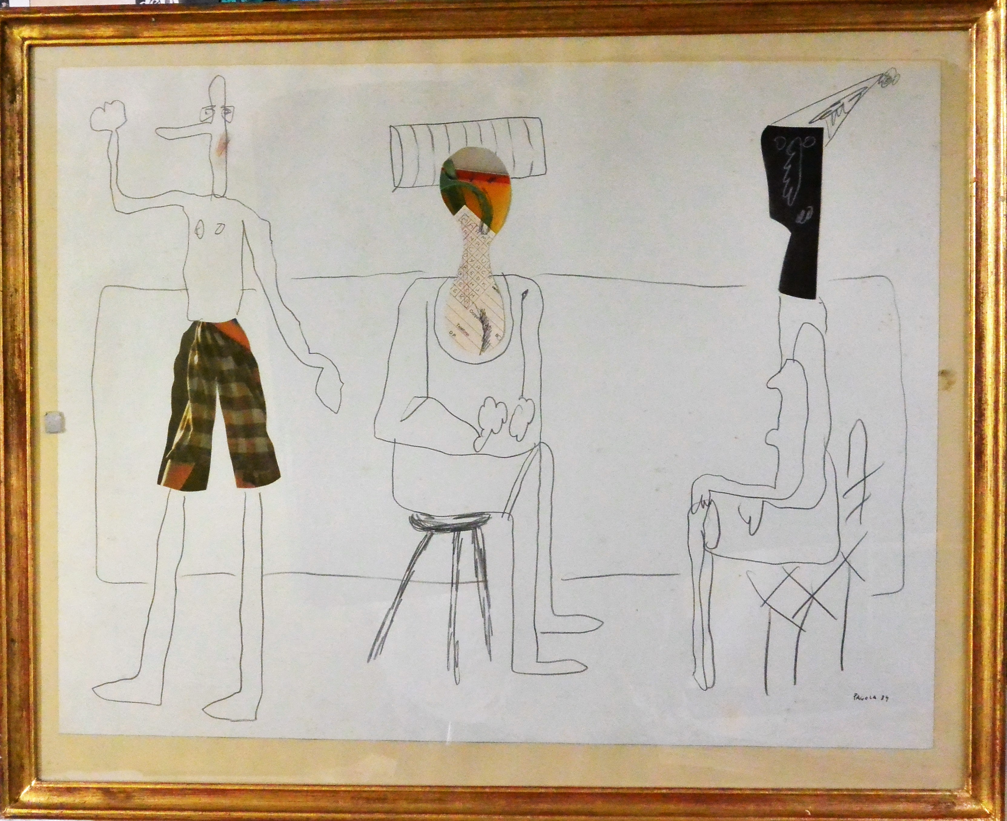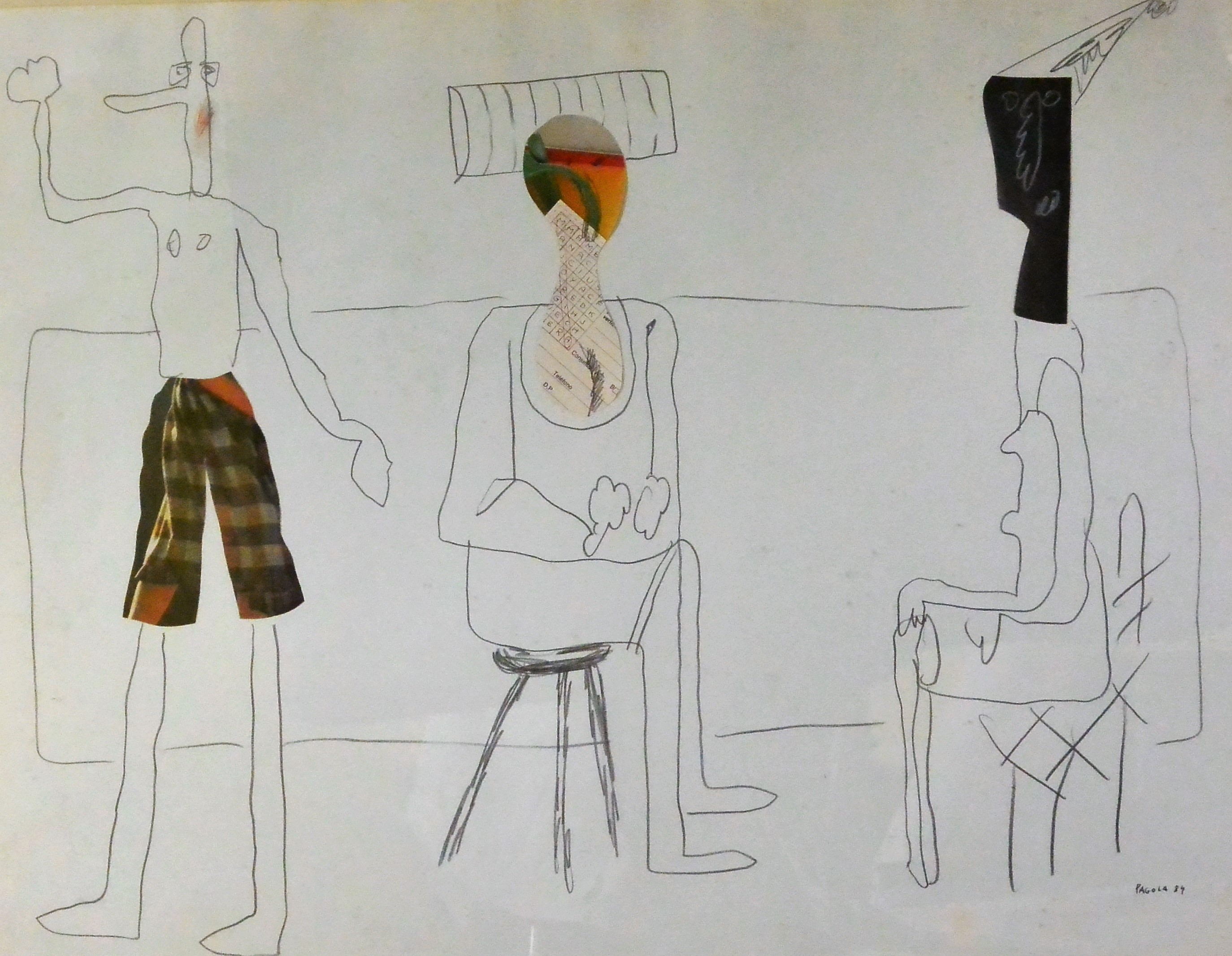 Javier Pagola 1984, Con el pantalón a cuadros, técnica mixta y collage, enmarcado, dibujo 50×65 cms. y marco 61×74 cms. Marco incluido