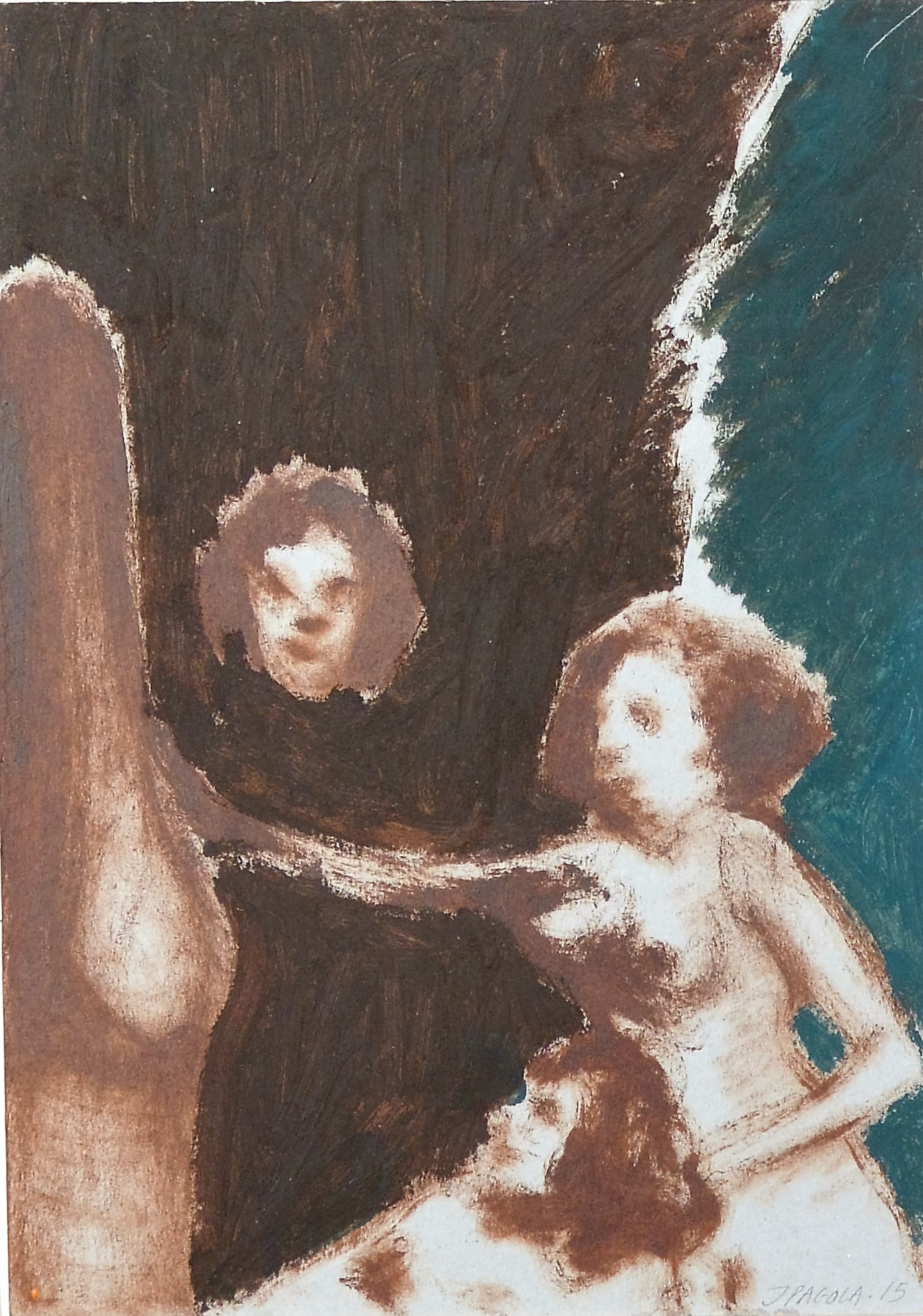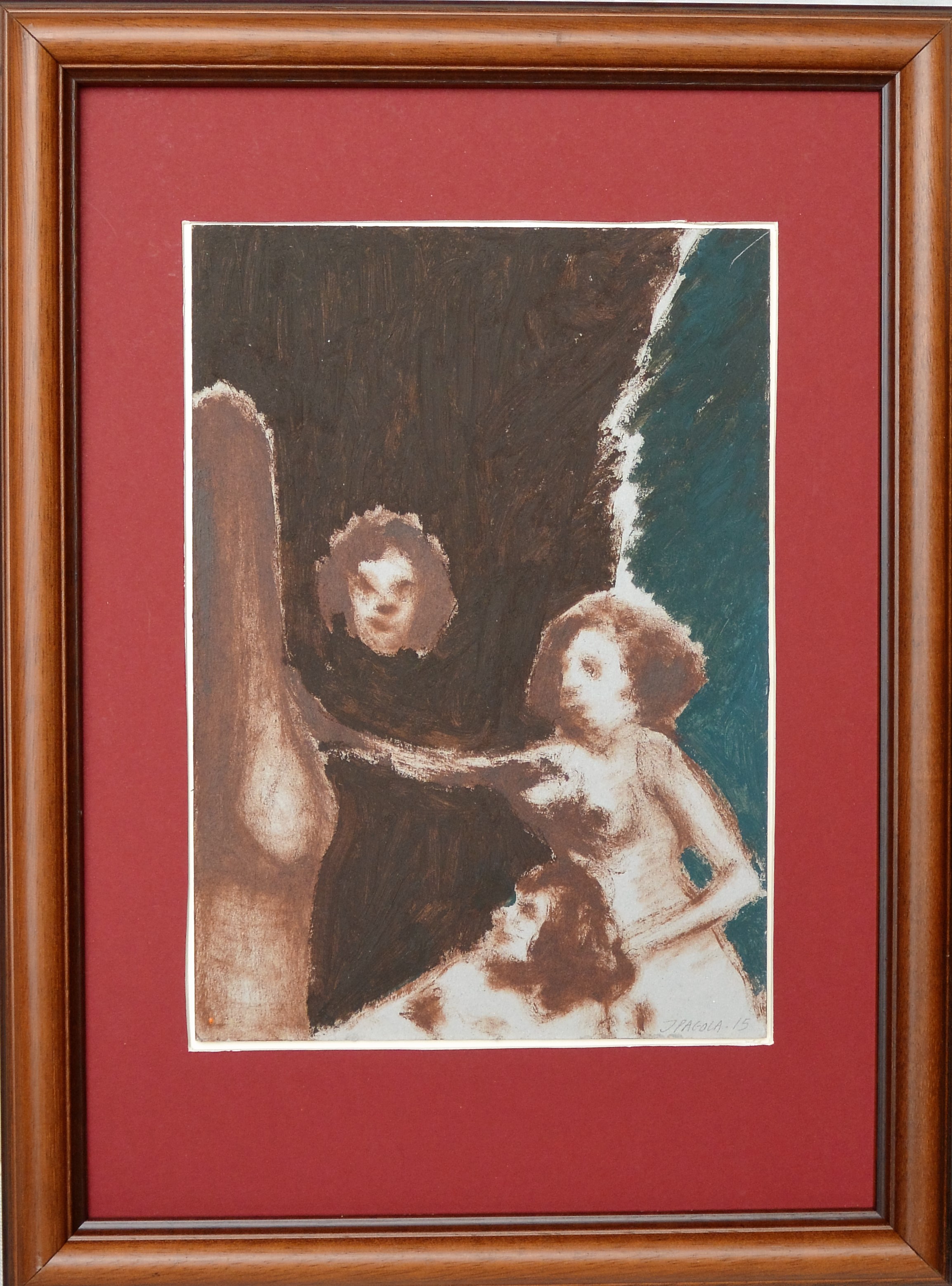 Javier Pagola 2015, Reunión de mujeres, pintura oleo cartulina, enmarcado, pintura 29,50×21 cms. y marco 47×35 cms.