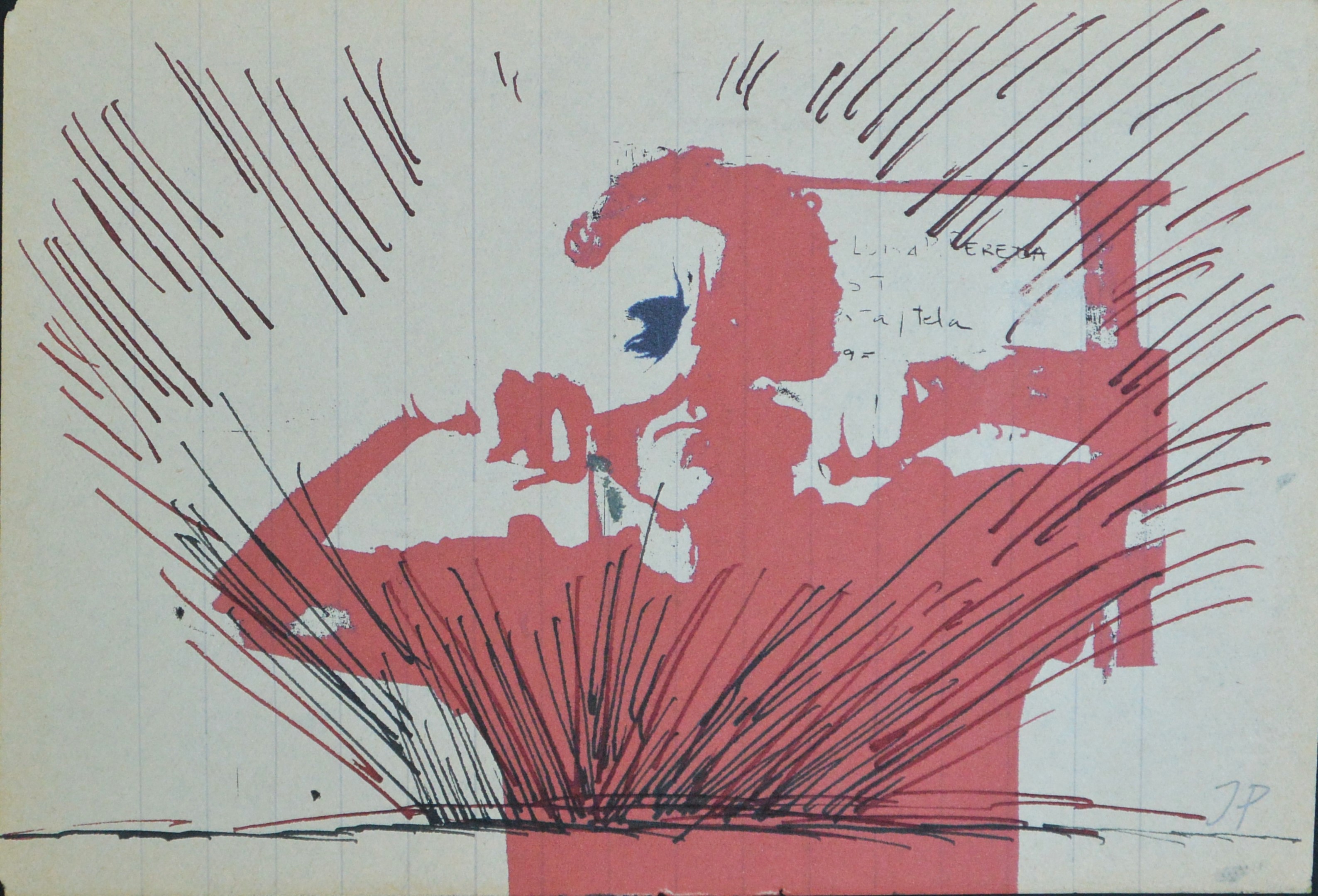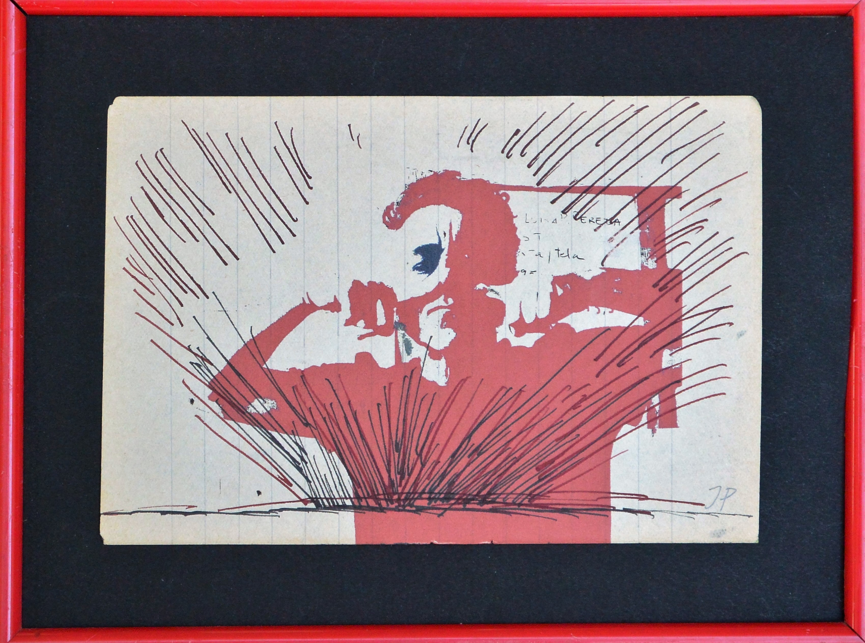 Javier Pagola, Autorretrato en rojo, tinta sobre impresión litográfica, enmarcado, dibujo 10,50×15,50 cms. y marco 16×21 cms.