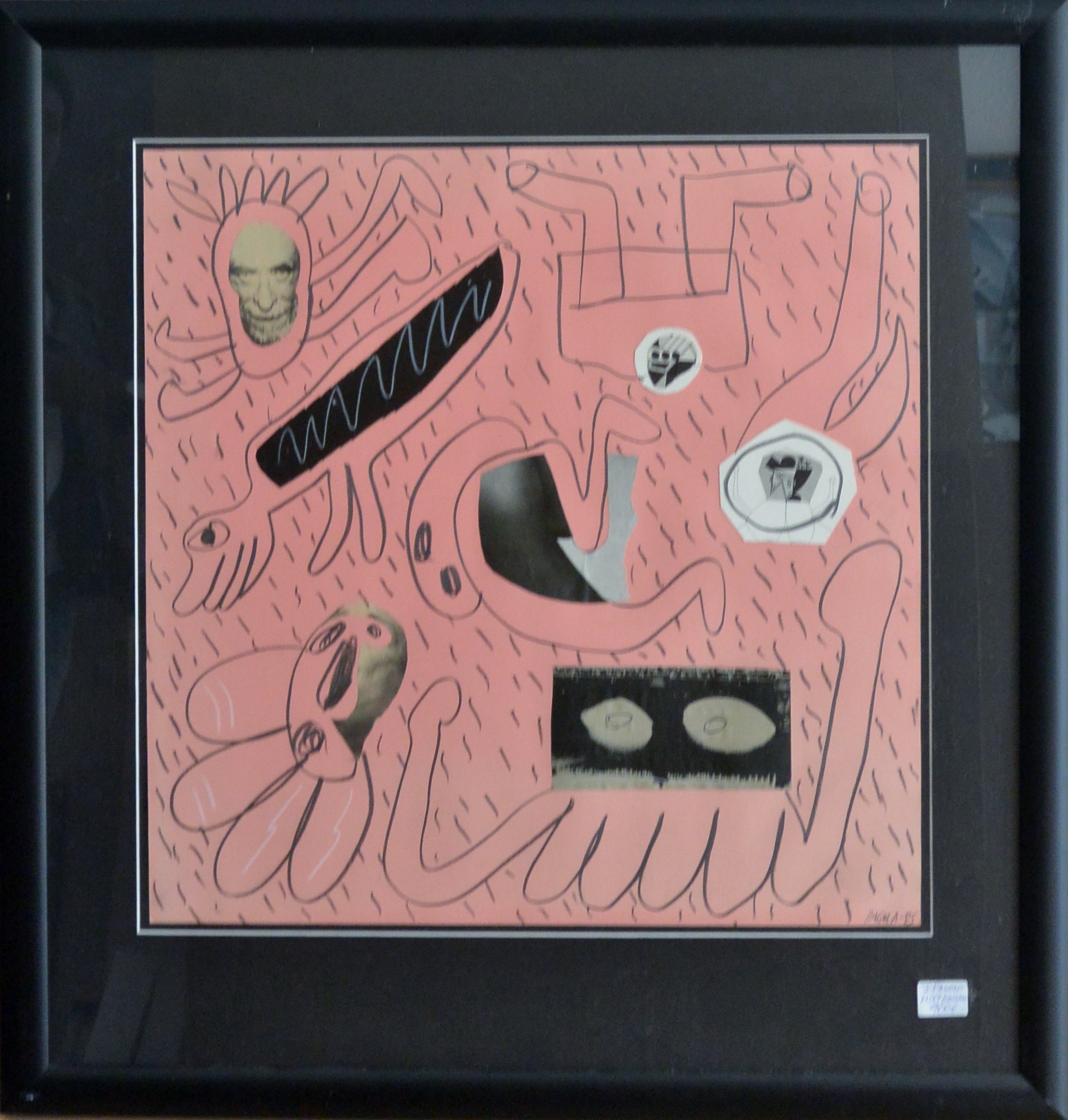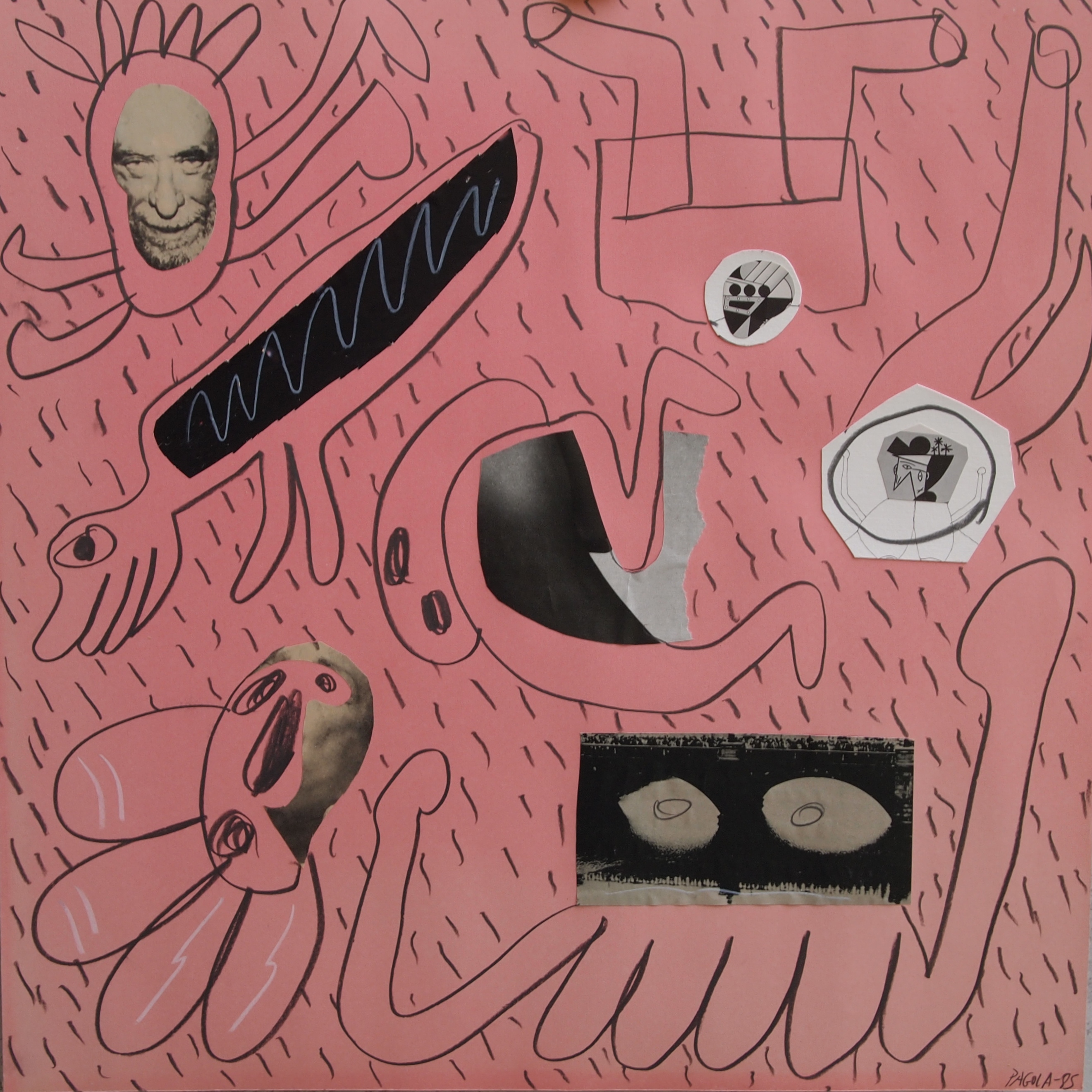 Javier Pagola 1985, Bukowski y mundo onírico, técnica mixta y collage cartulina, enmarcado, dibujo 50×50 cms. y marco 72×69 cms.