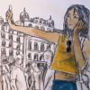Javier Pagola, Desfile sobre fondo amarillo, dibujo técnica mixta cartulina, enmarcado, dibujo 23×50 cms. y marco 40×60 cms.