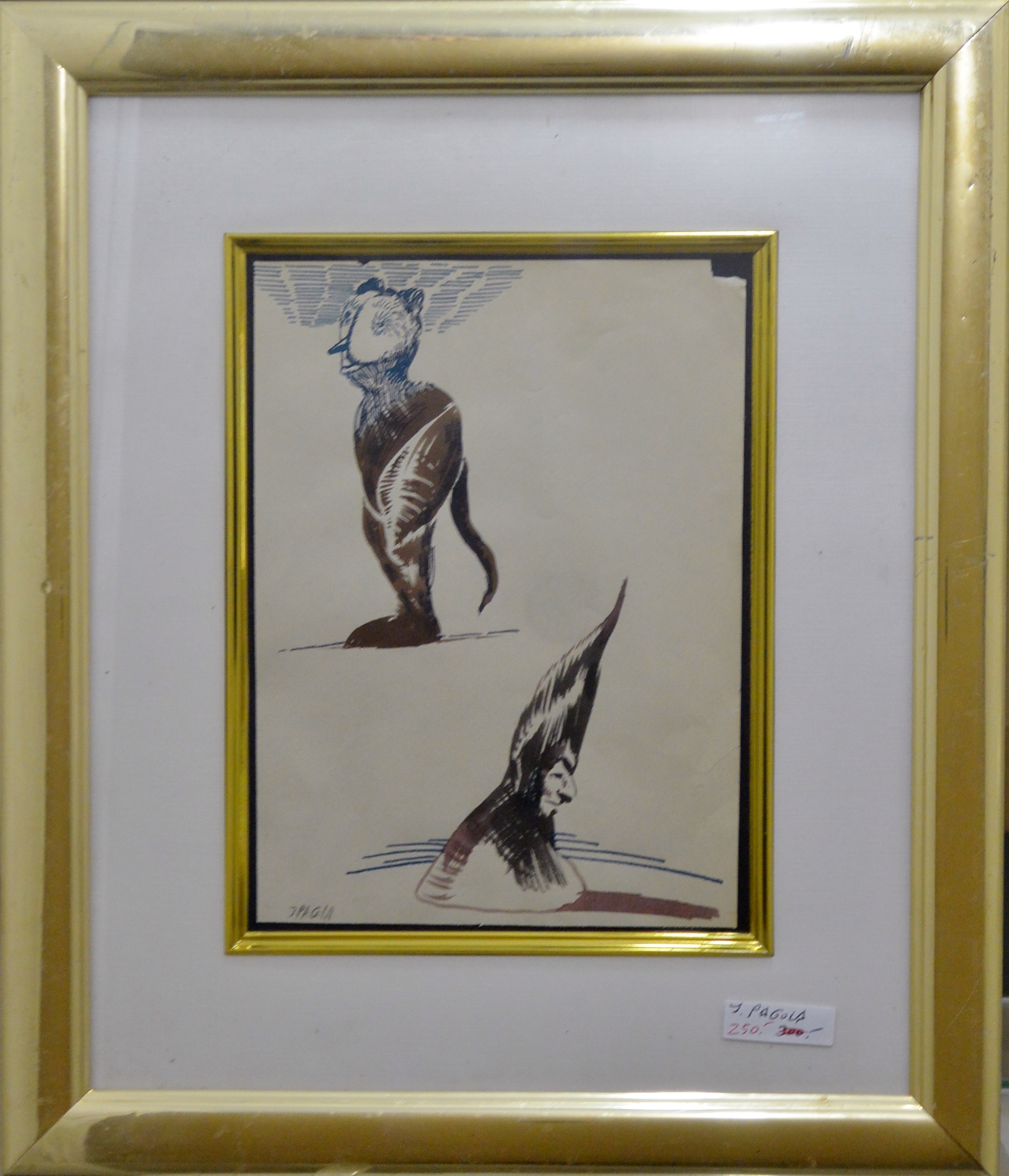 Javier Pagola Dos personajes uno hundido, dibujo tinta papel, enmarcado, dibujo 23×16,50 cms. y marco 40×34 cms. Marco incluido