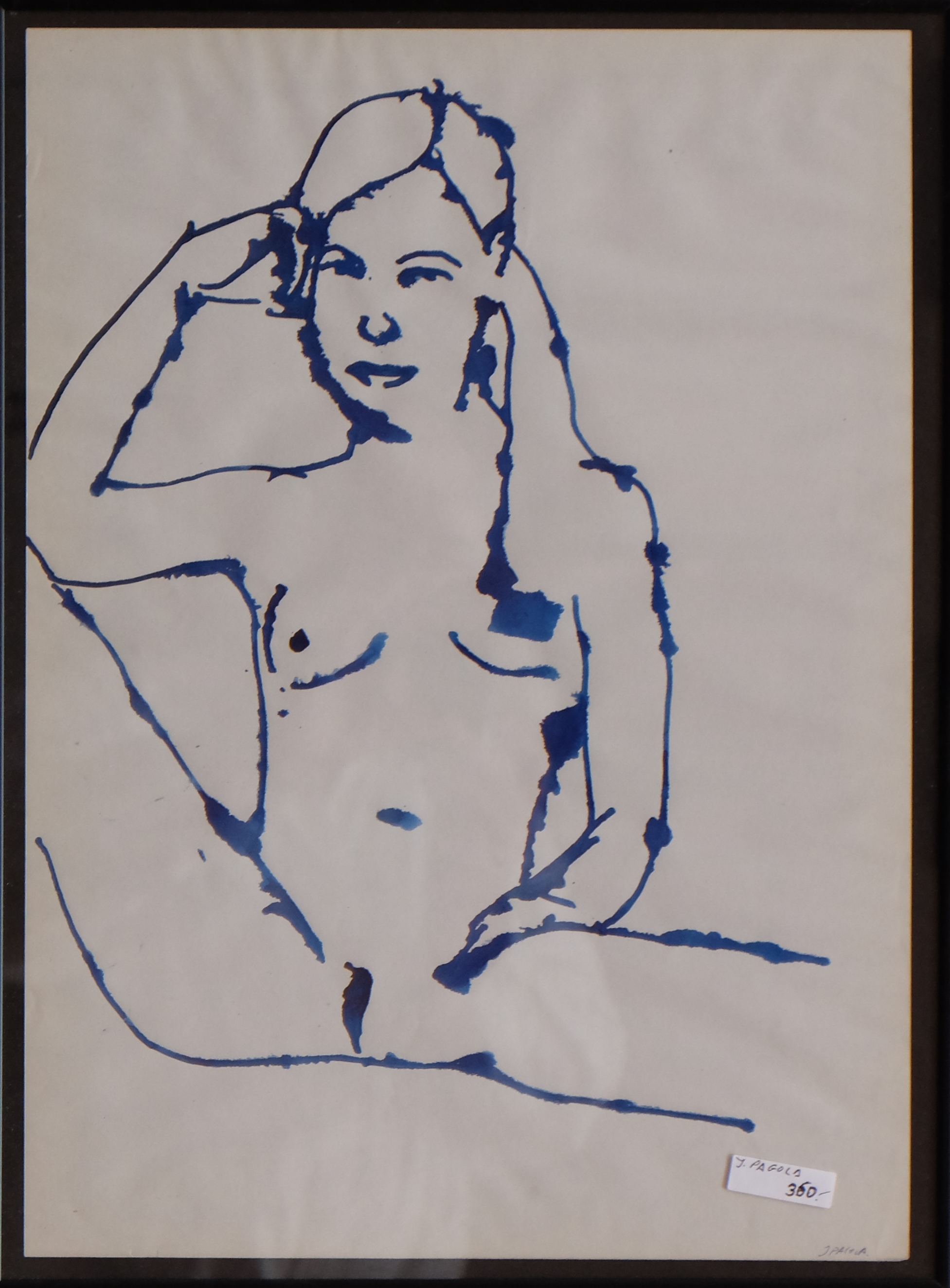 Javier Pagola, Joven desnuda sentada de frente, acrílico papel, enmarcado, dibujo 44×32 cms. y con marco 47×35 cms.