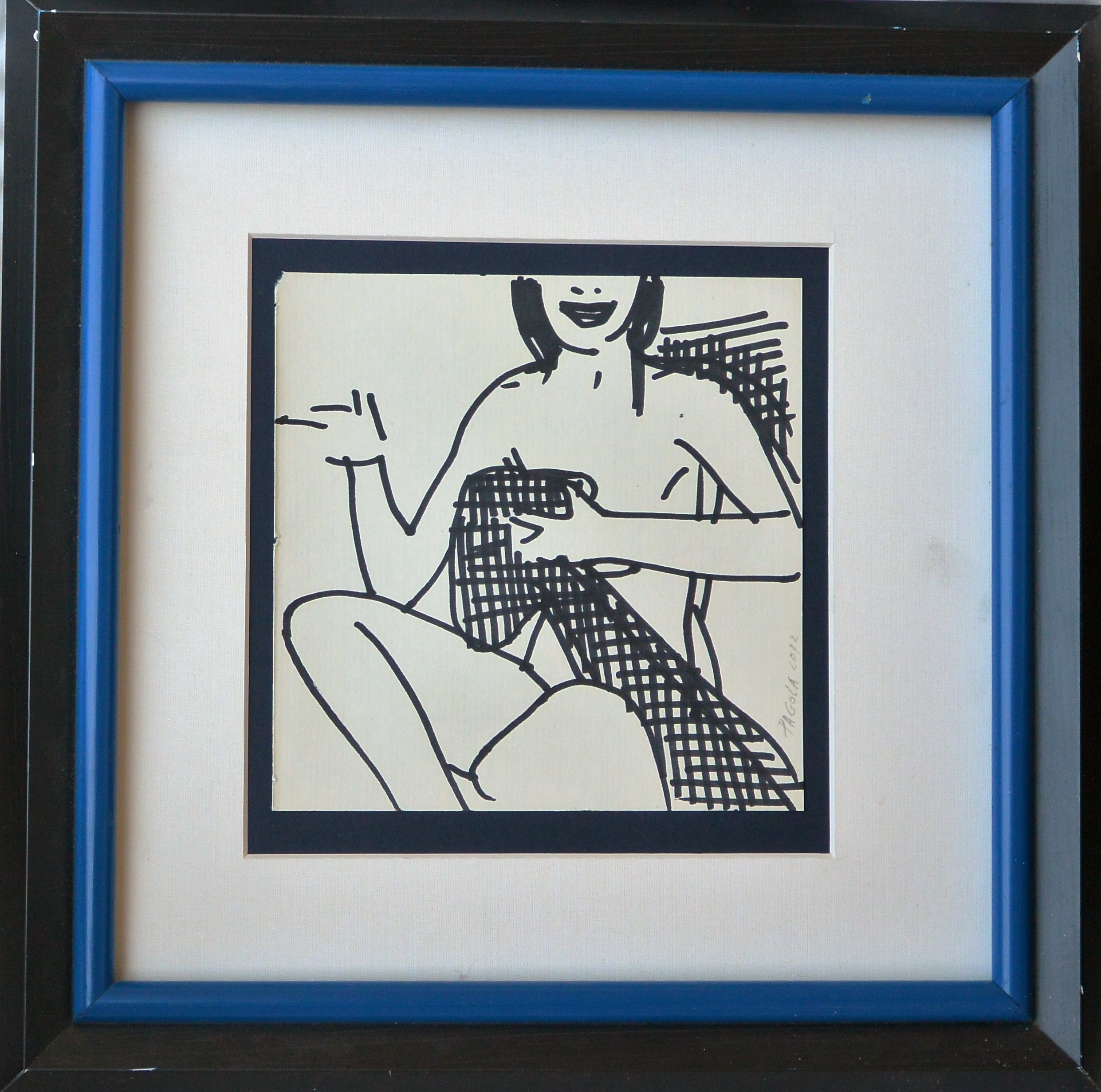 Javier Pagola, Joven en la playa, dibujo tinta papel, enmarcado, dibujo 17×17 cms. y marco 36×36 cms. Marco incluido