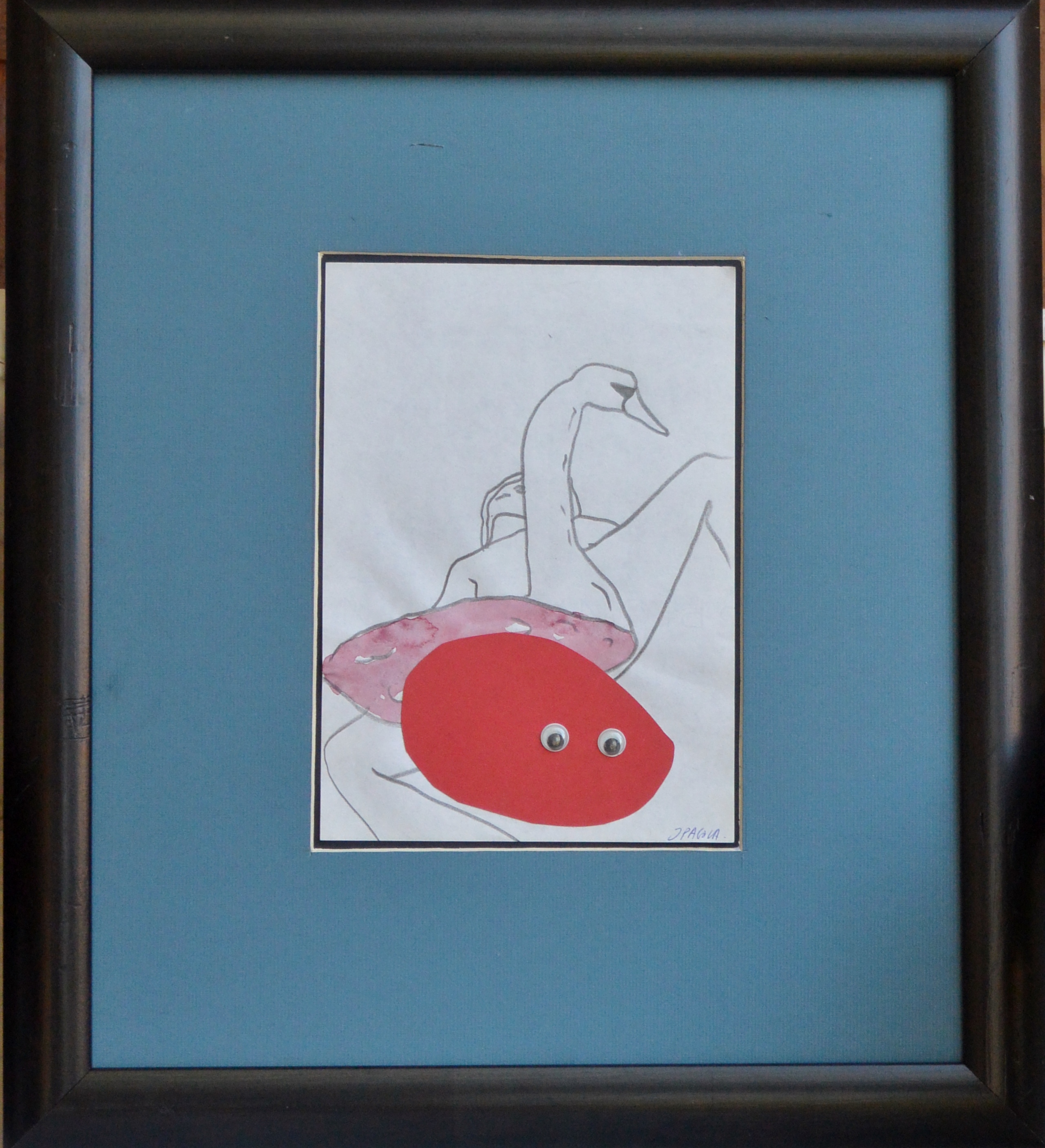 Javier Pagola, Leda y el cisne, dibujo técnica mixta y collage papel, enmarcado, dibujo 21×15 cms. y marco 42×38 cms. Marco incluido