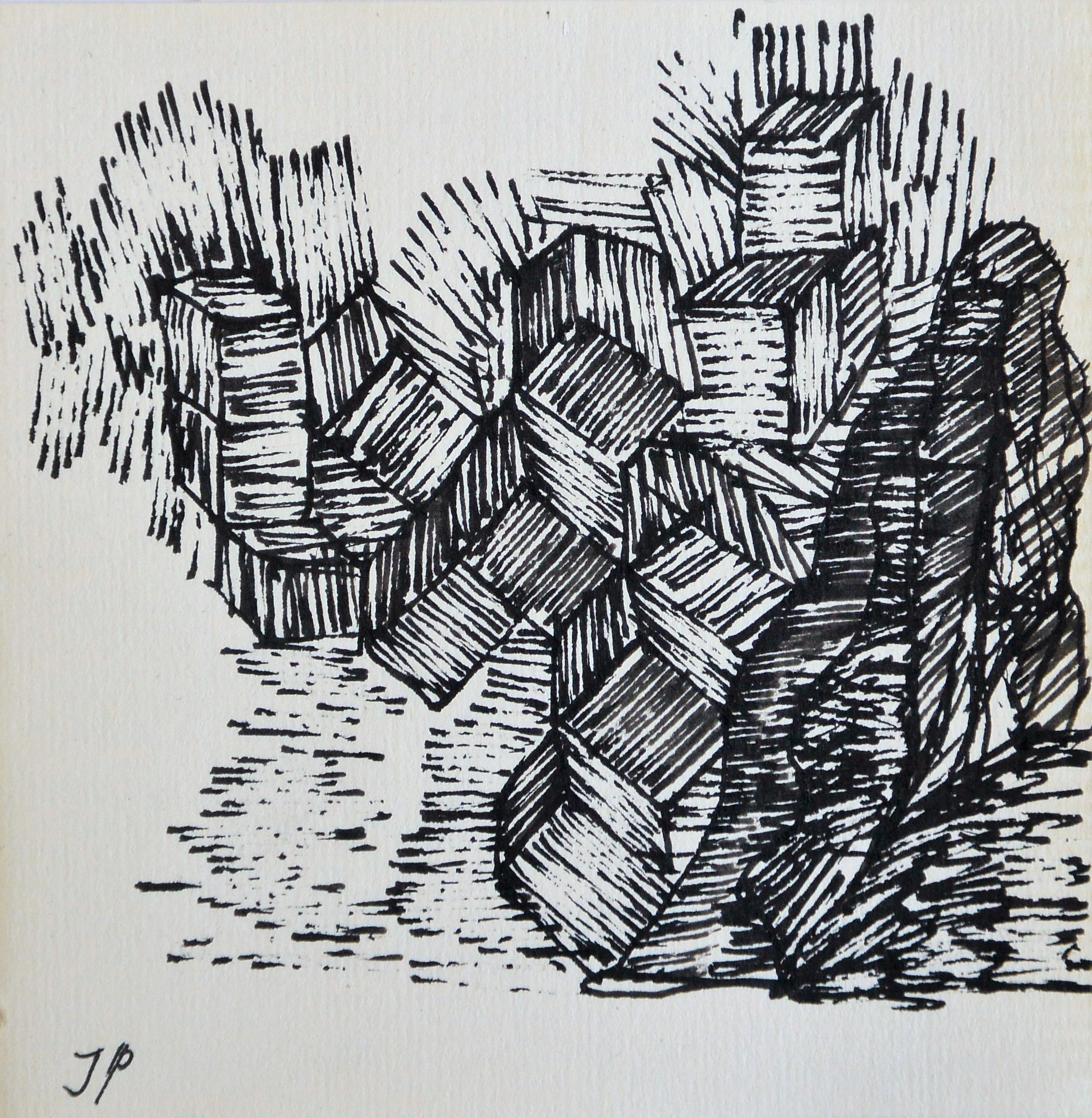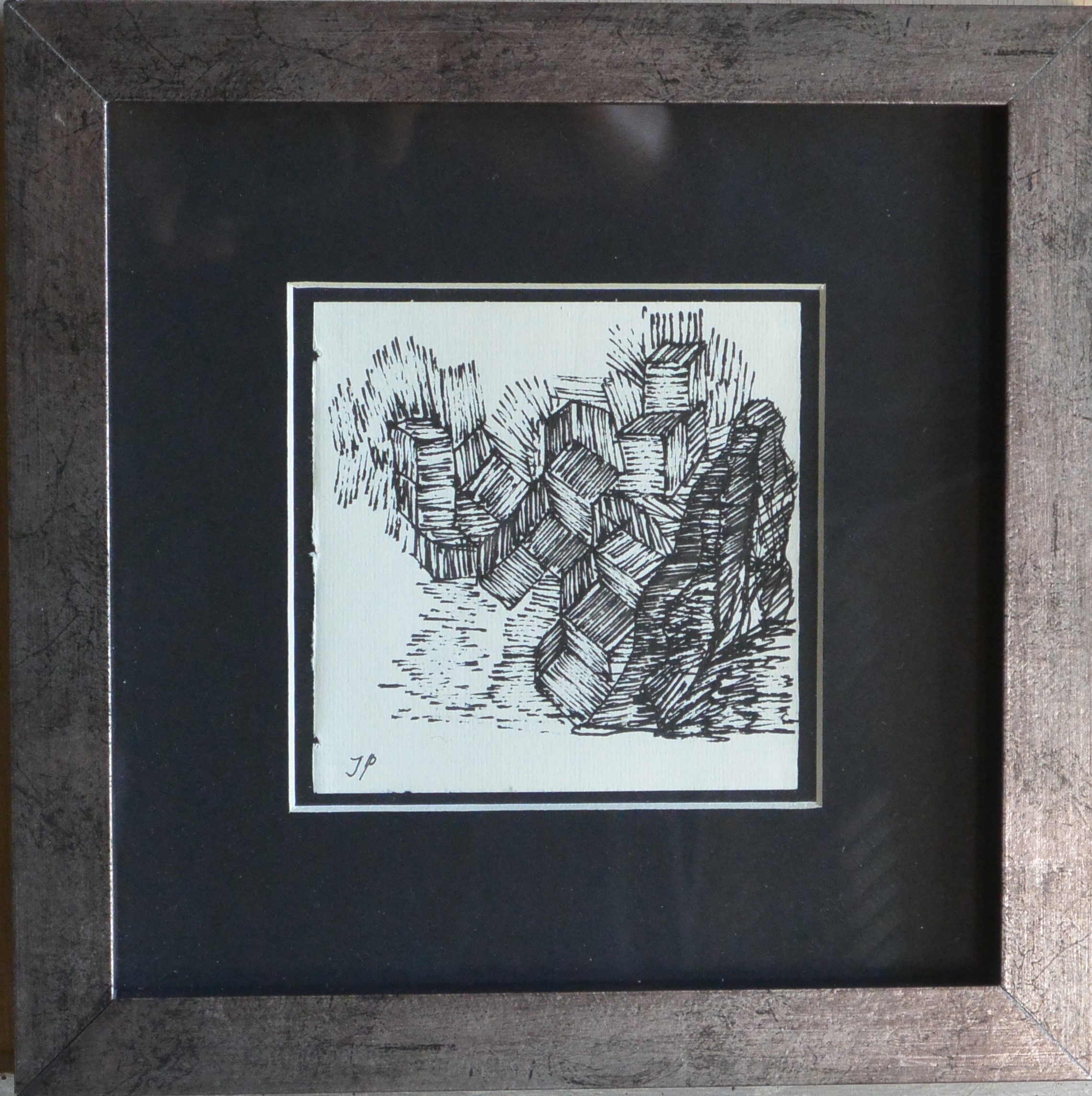 Javier Pagola, Paisaje cúbico, dibujo tinta papel, enmarcado, dibujo 10×10 cms. y marco 22×22 cms.