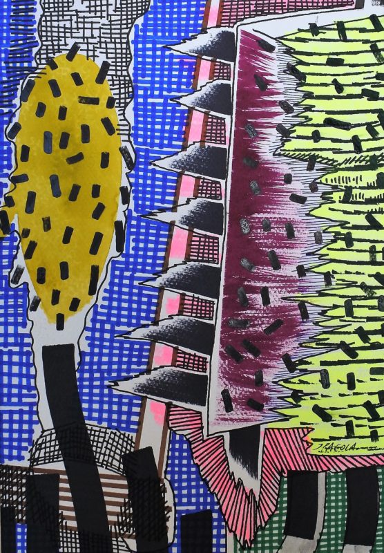 Javier Pagola, Paisaje urbano con arbol, dibujo técnica mixta papel, enmarcado, dibujo 30×20 cms. y marco 42,50×32,50 cms.