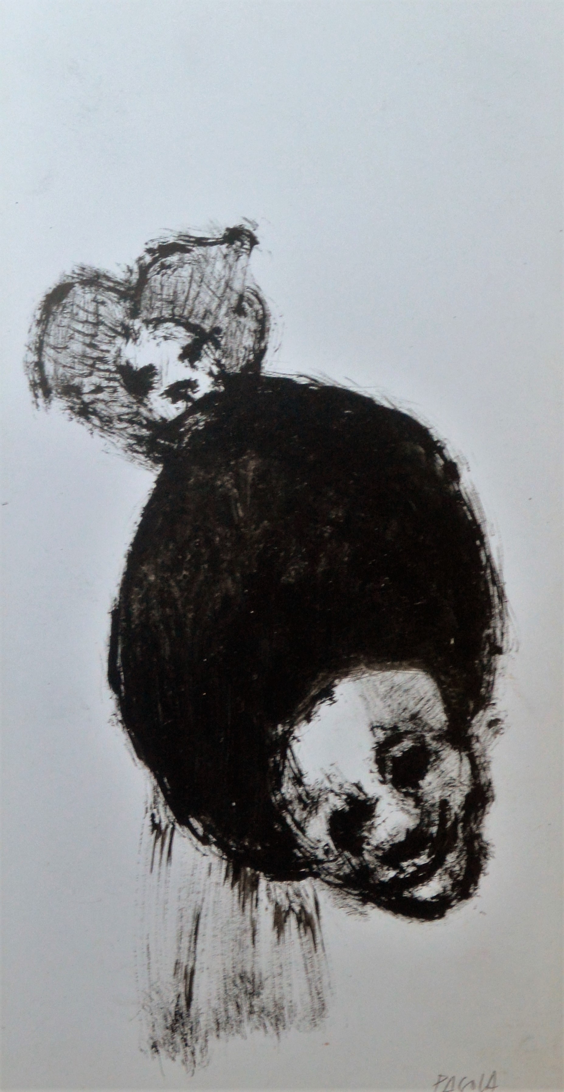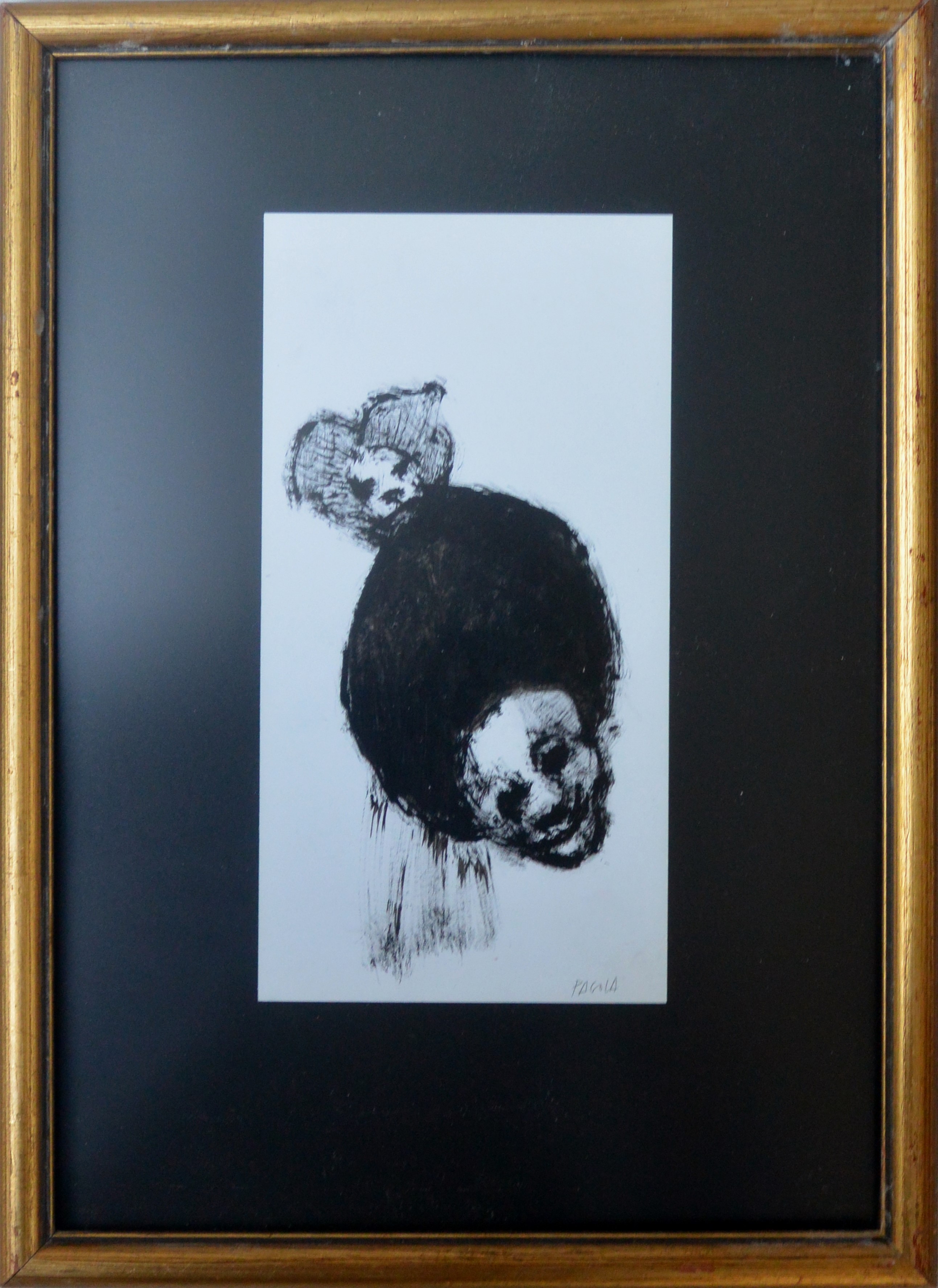 Javier Pagola, Personaje con cabeza pelota, dibujo acrílico cartulina, enmarcado, dibujo 21,50×11 cms. y marco 35×25,50 cms. Marco incluido