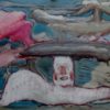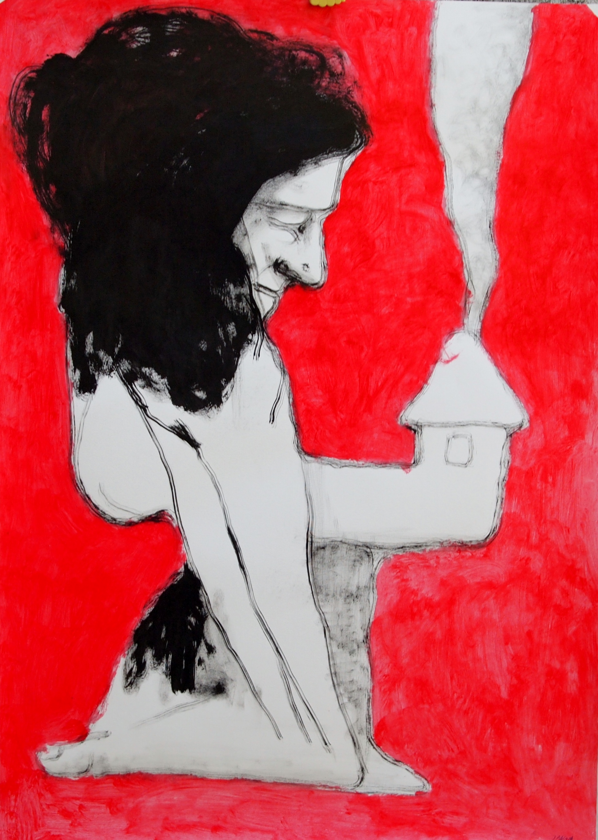 Javier Pagola, Personaje con chimenea y fondo rojo, pintura acrílico papel, enmarcado, pintura 70×50 cms. y marco 90×69 cms. Marco incluido