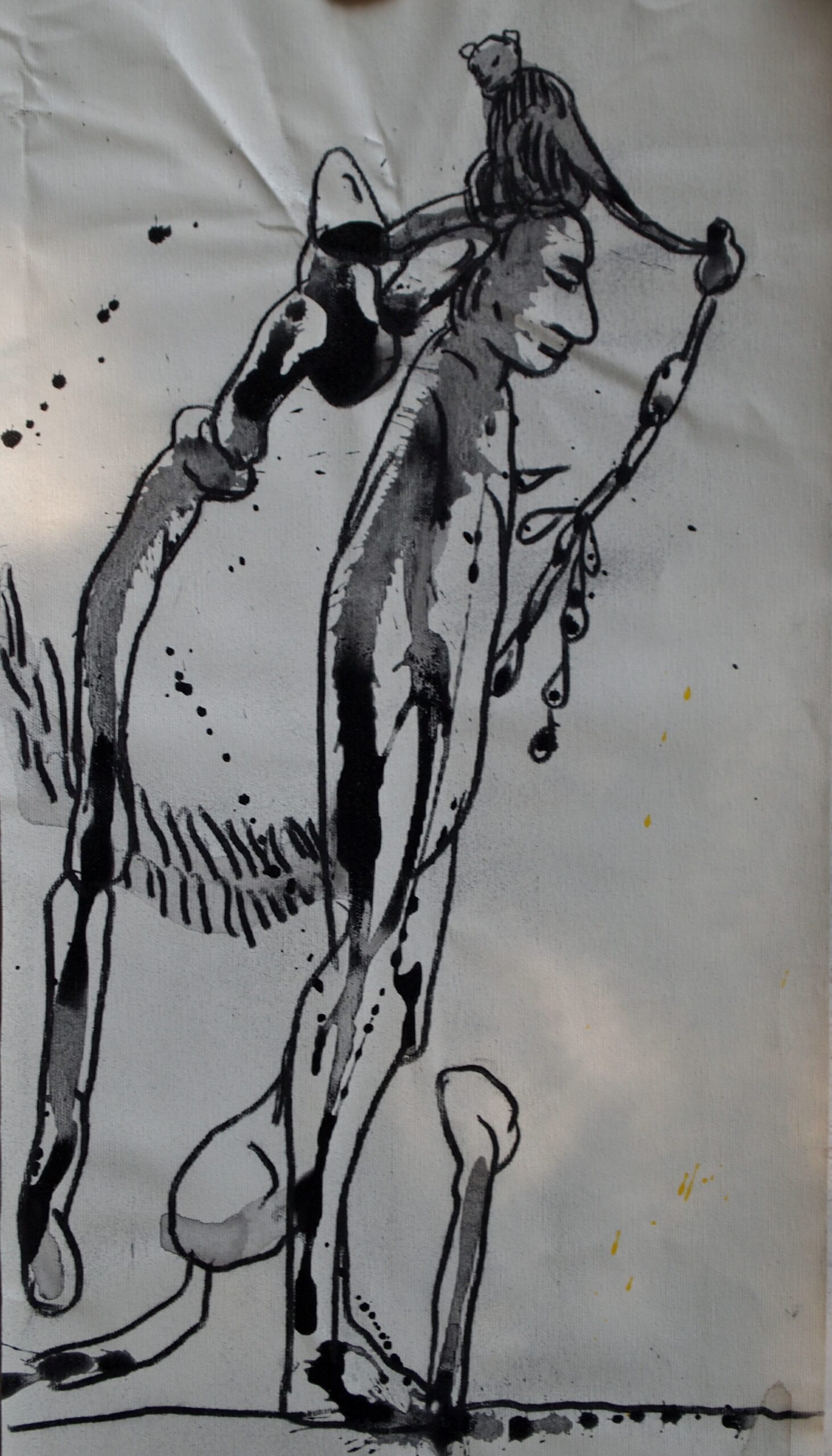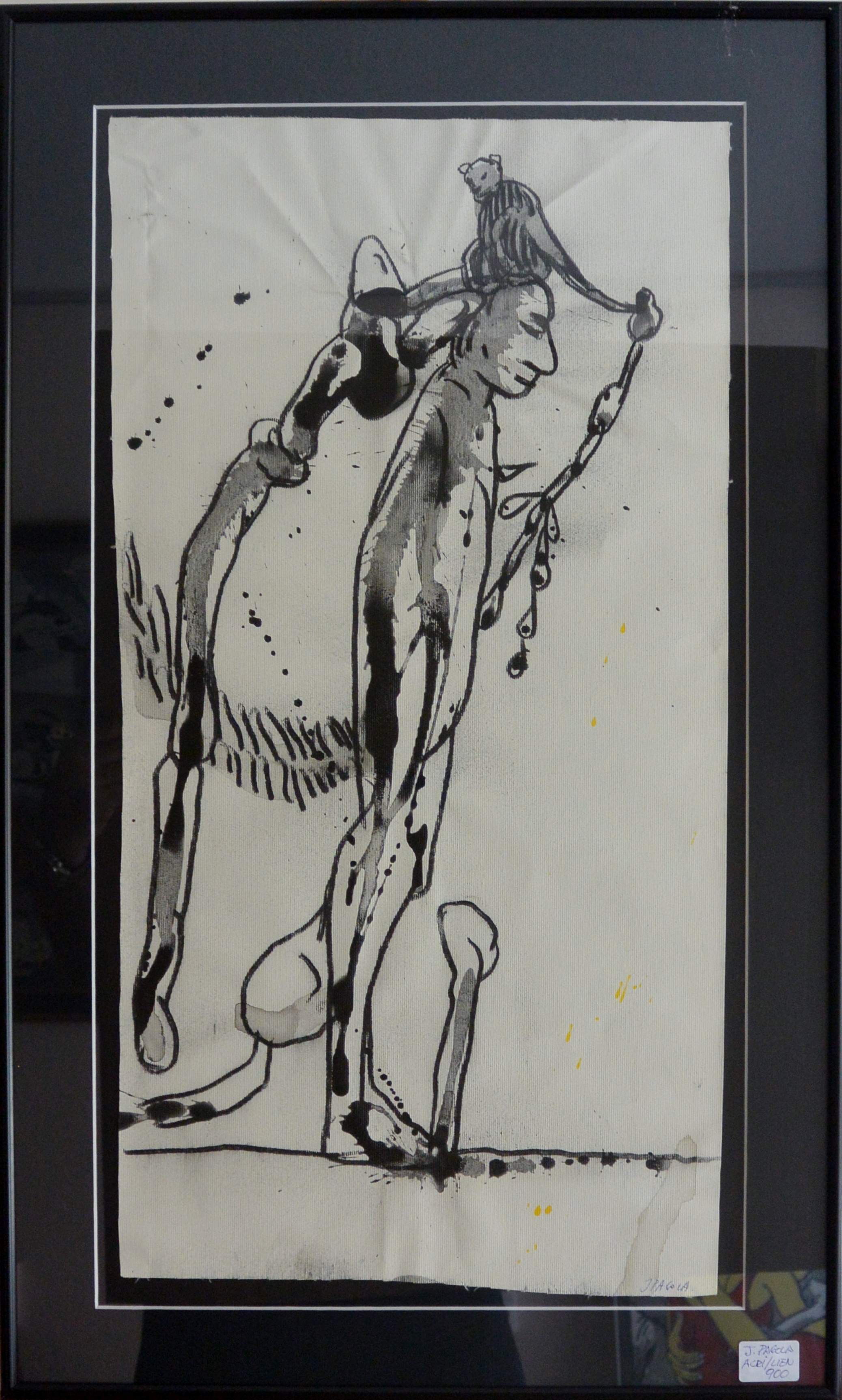Javier Pagola, Personaje con mono en la cabeza, pintura oleo lienzo, enmarcado, pintura 62×32 cms. y marco 75×45 cms. Marco incluido