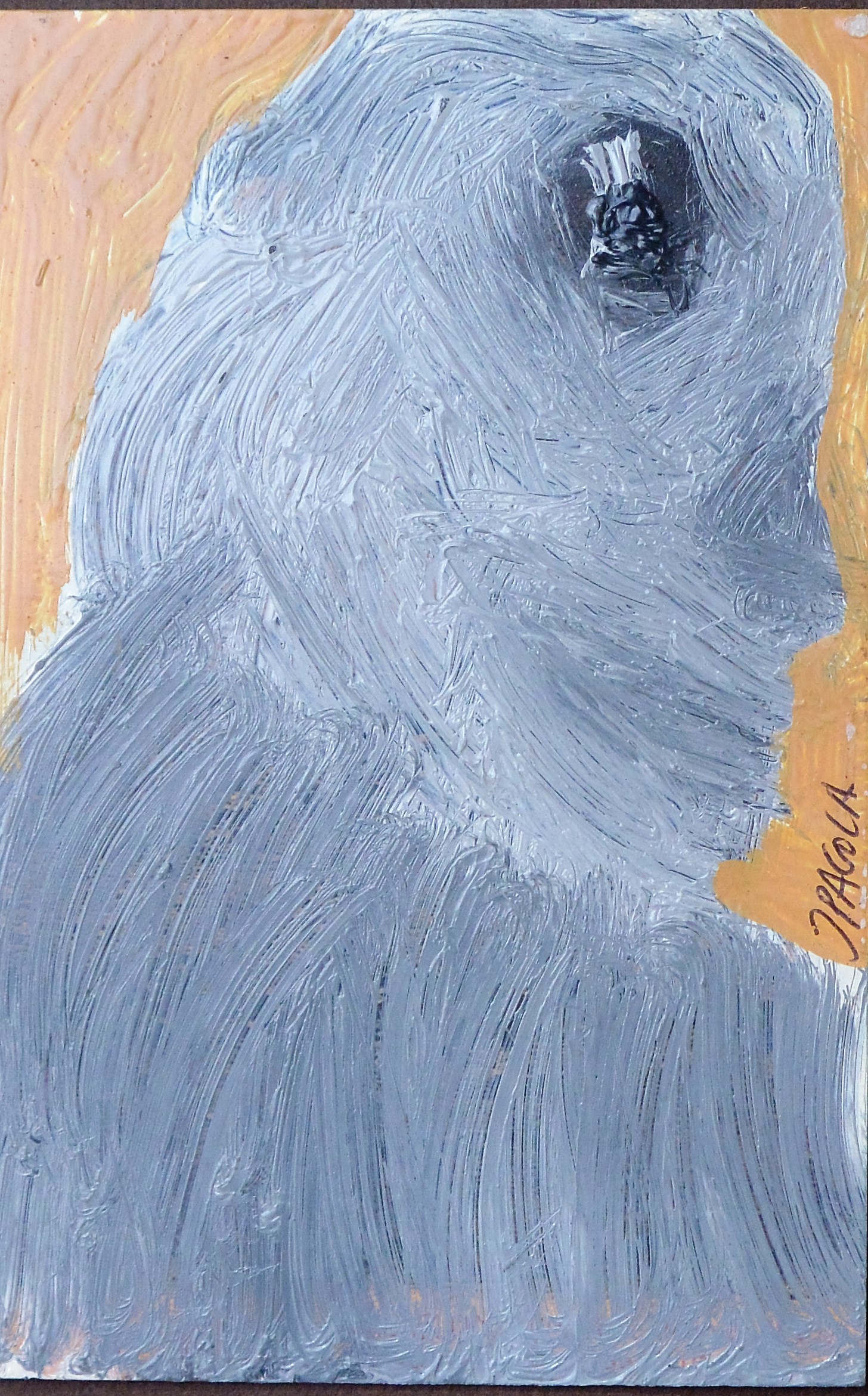 Javier Pagola, Personaje del bosque, pintura oleo cartulina, enmarcado, pintura 14×9 cms. y marco 28,50×23 cms.