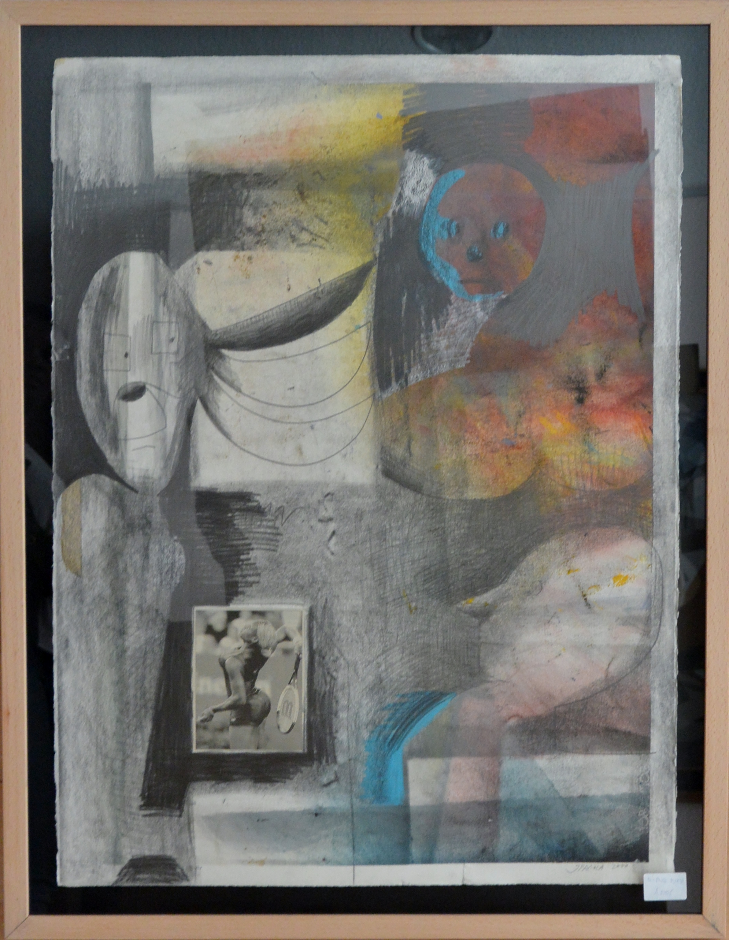 Javier Pagola 2000, Tenis con Serena Williams, técnica mixta y collage papel, enmarcado, dibujo 76×57 cms. y marco 86×66 cms. Marco incluido