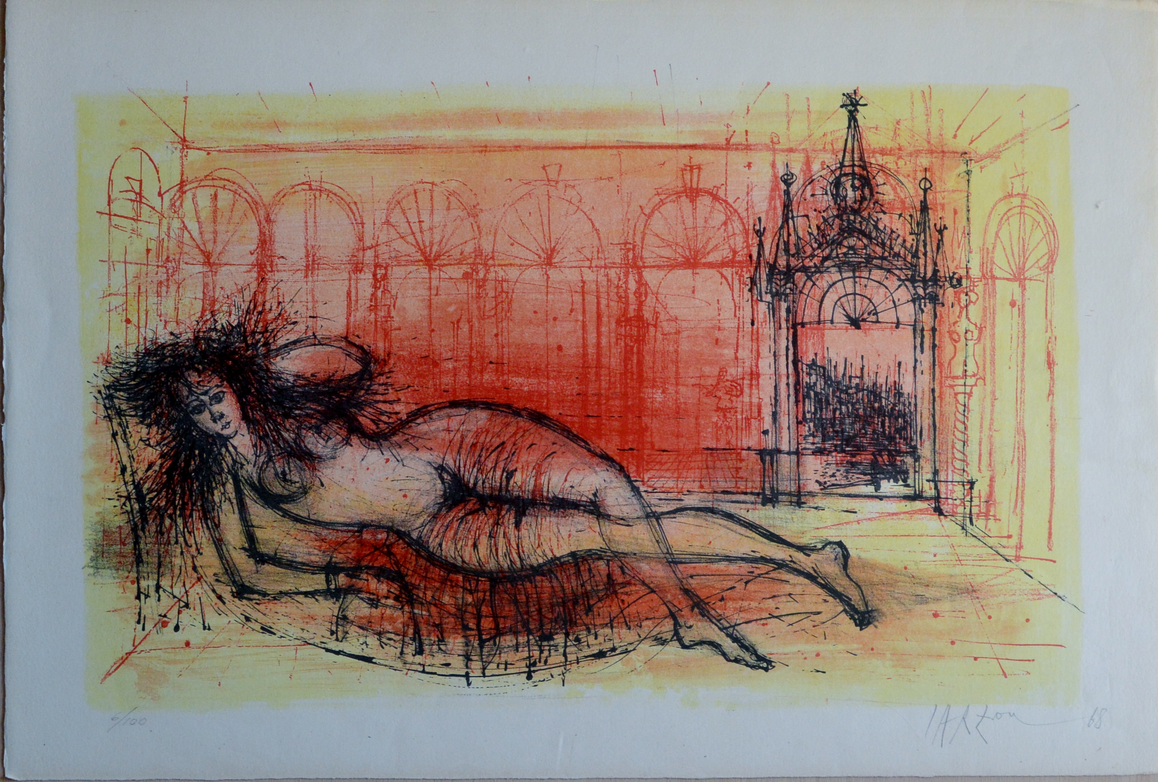 Jean Carzou, Mujer tumbada, litografía, numerada 6/100 y firmada a lápiz en 1968, 38,50×57 cms.