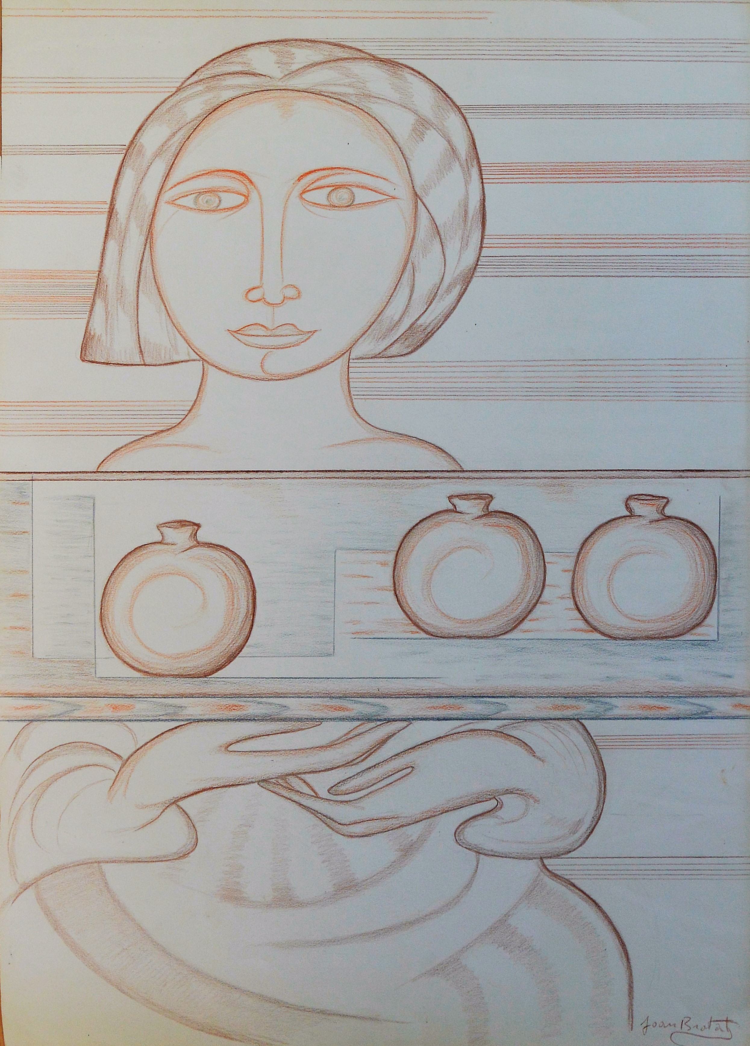 Joan Brotat, Mujer con vasijas, lápices colores cartulina, 70×50 cms.