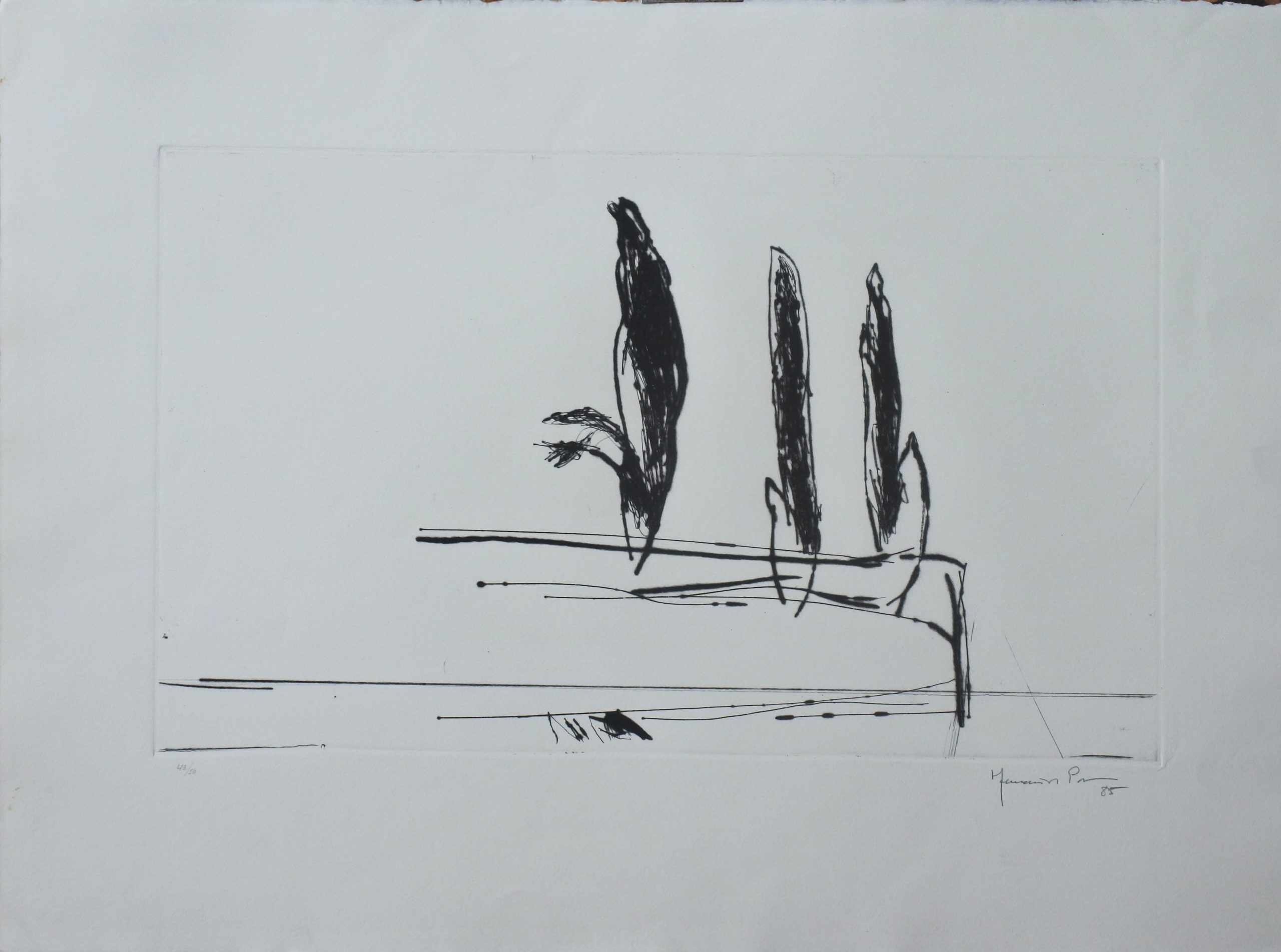 Joan Hernandez Pijuan, Paisatge amb Xiprers VI, grabado aguafuerte, edición 50 ejemplares, numerado, datado 85 y firmado a lápiz, plancha 35×59 cms. y papel 56×76 cms.