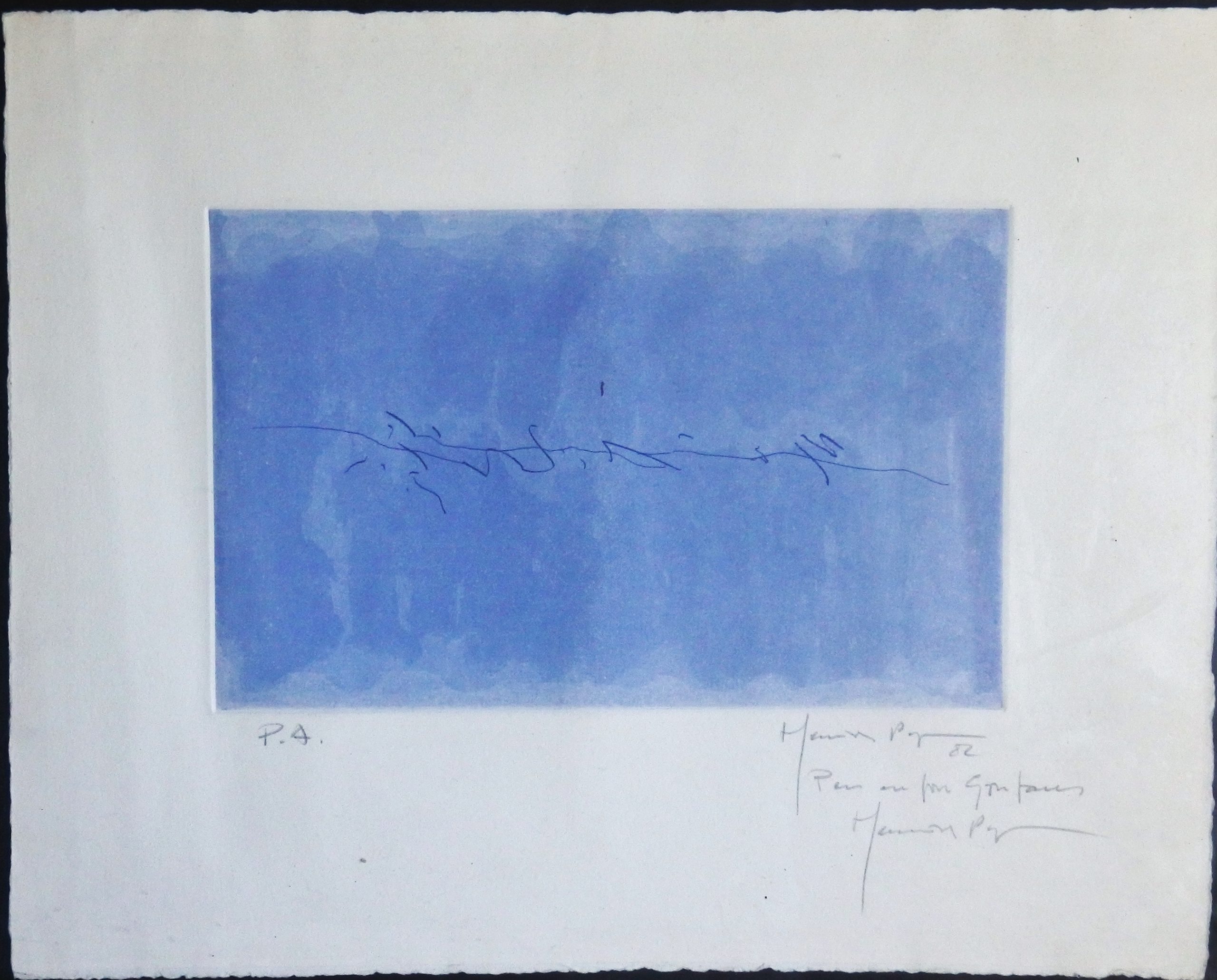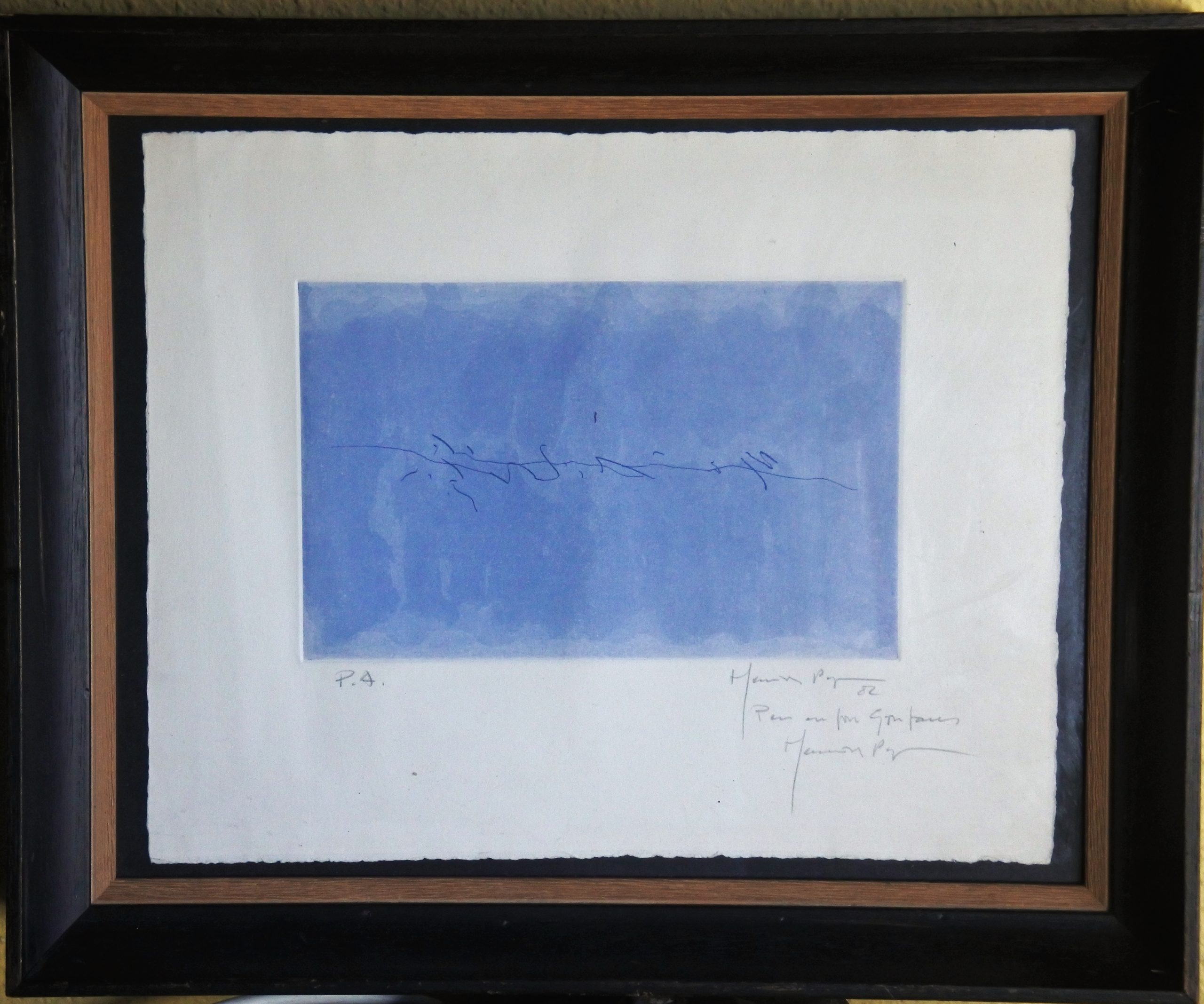 Joan Hernandez Pijuan, 1982, Sin título, grabado aguatinta, edición 50 ejemplares, justificado p.a., dedicado y firmado a lápiz, enmarcado, plancha 15×24 cms. papel 30×37 cms y marco 39×47 cms.
