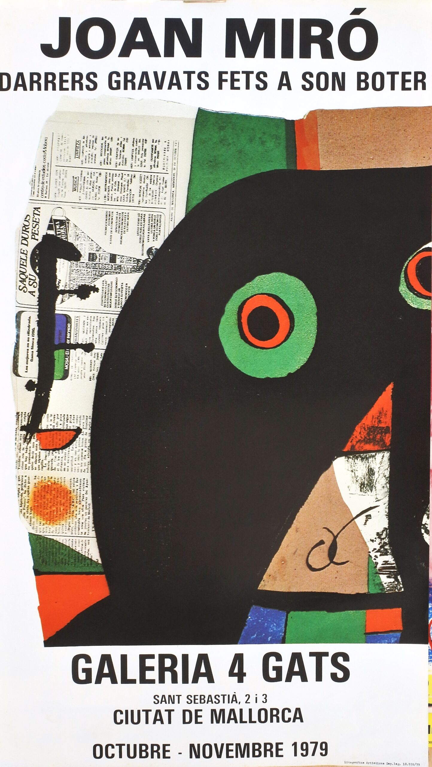 Joan Miró, Darrers gravats fets a son boter, cartel litográfico original exposición en Galeria 4 Gats en Palma de Mallorca, 70×40 cms.