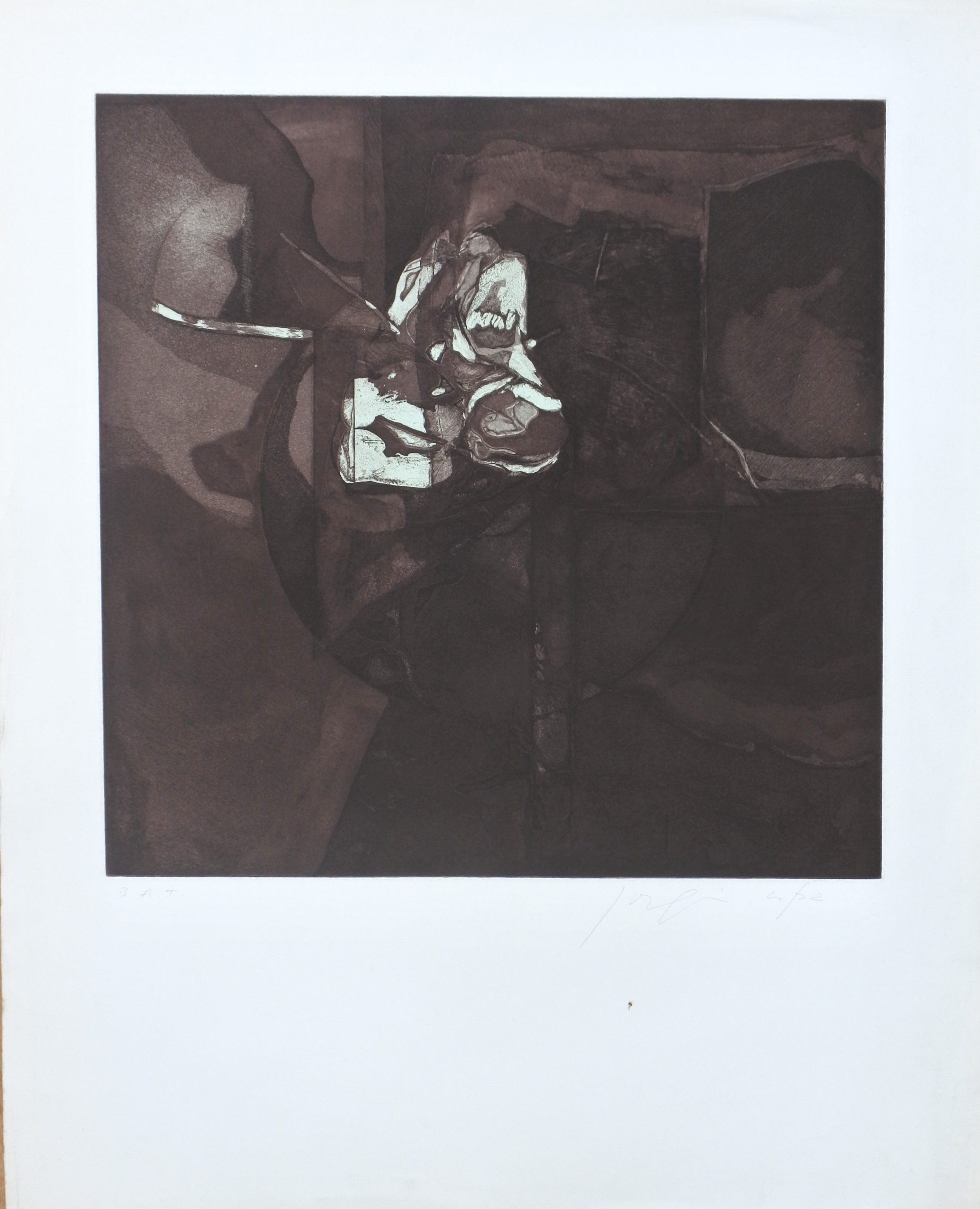 Joaquín Capa, Composición sin título, grabado aguafuerte, numerado BAT (bon a tirer) y firmado a lápiz, plancha 49,50×49,50 cms. y papel 78×63 cms.