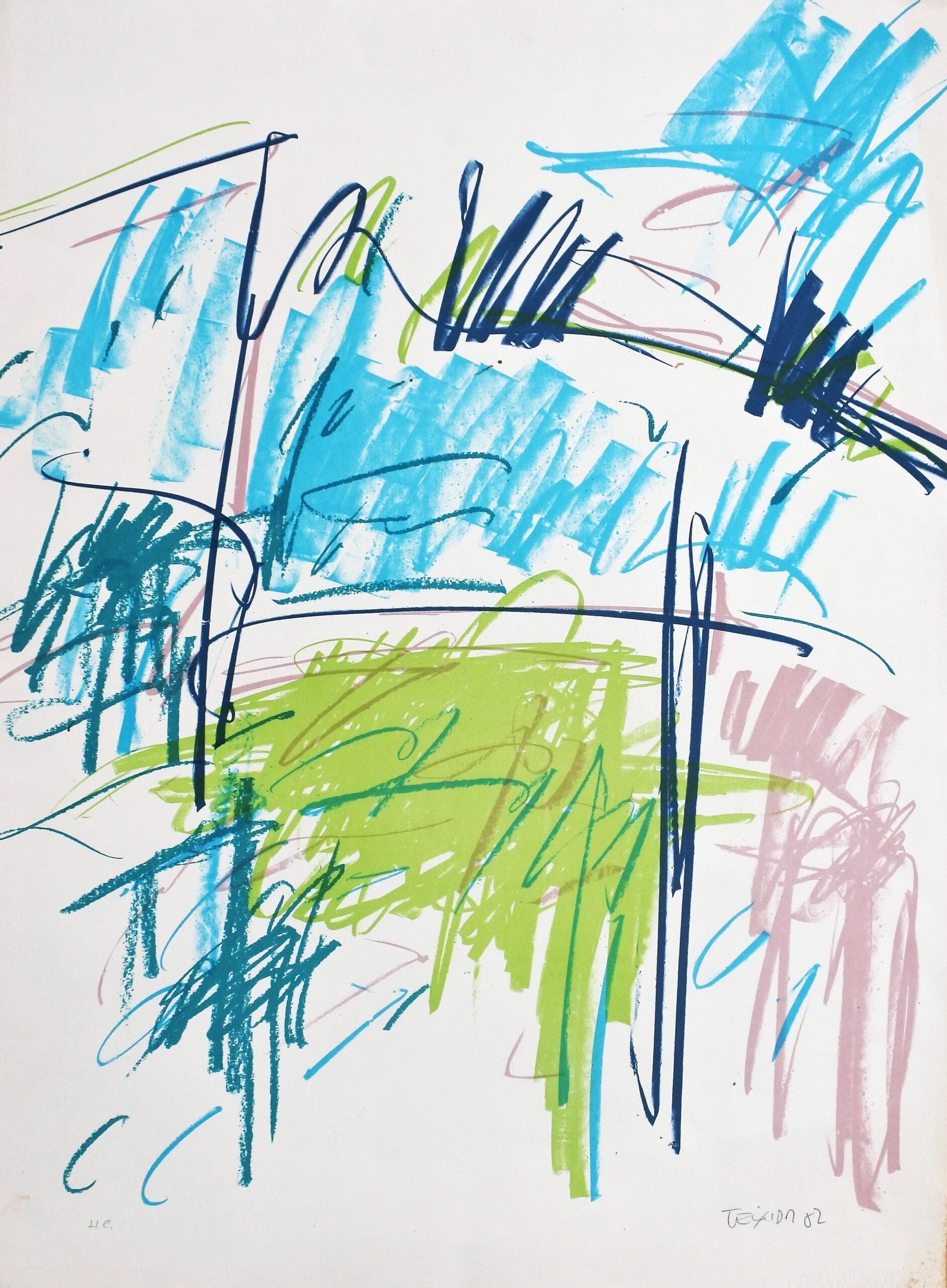 Jordi Teixidor, A. L. 82, litografia, avant la lettre para el cartel de la exposición en la galeria Joan Prats Barcelona en 1982, edición 150 ejemplares, numerado h.c. datado 82 y firmado a lápiz, 75×56 cms.