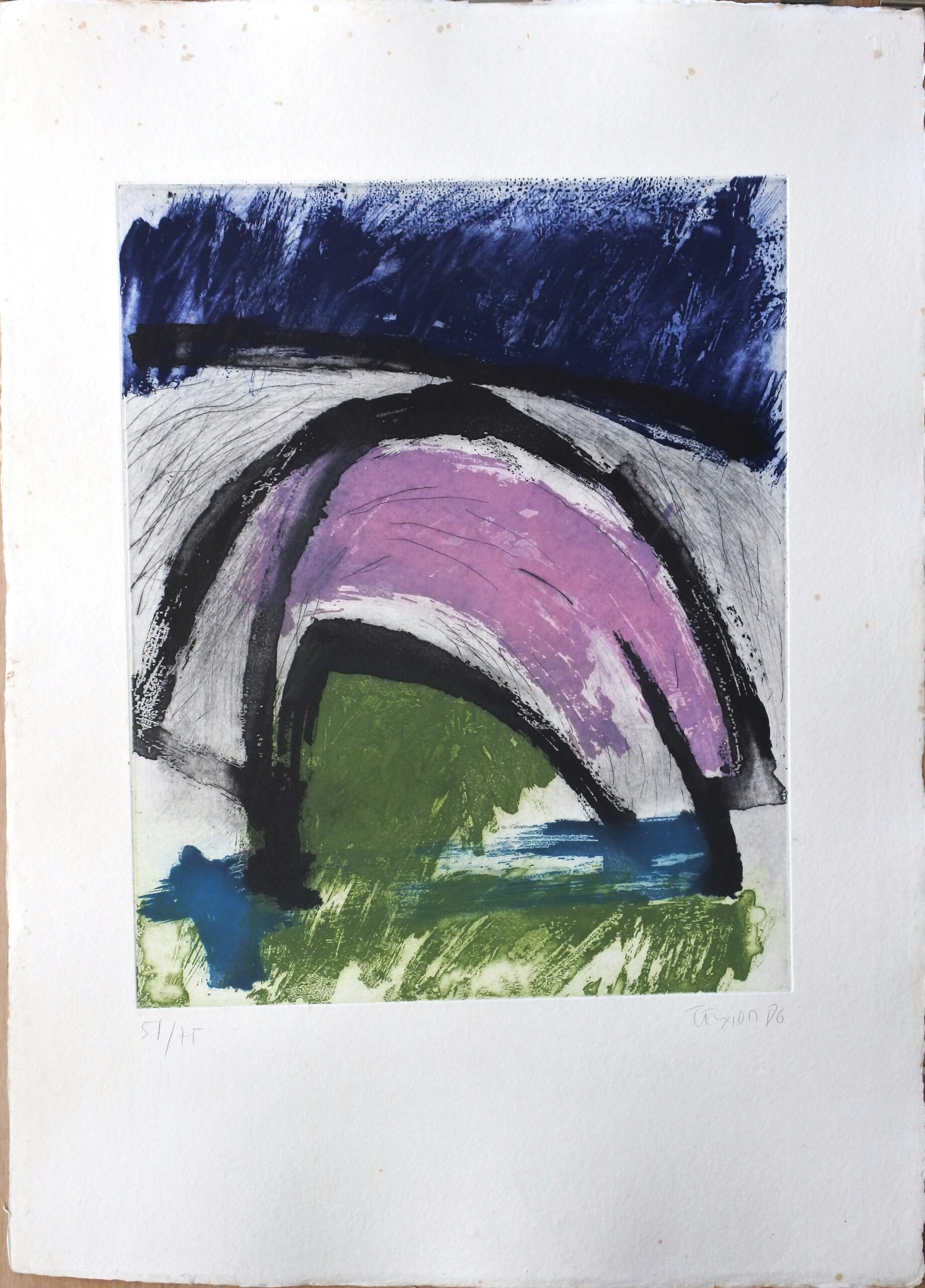 Jordi Teixidor, Refugio, grabado punta seca y goma sobre papel artesanal 600 gramos., edición 75 ejemplares, numerado, datado 86 y firmado a lápiz, plancha 50×40 cms. y papel 76×56 cms. Pequeñas manchas de óxido
