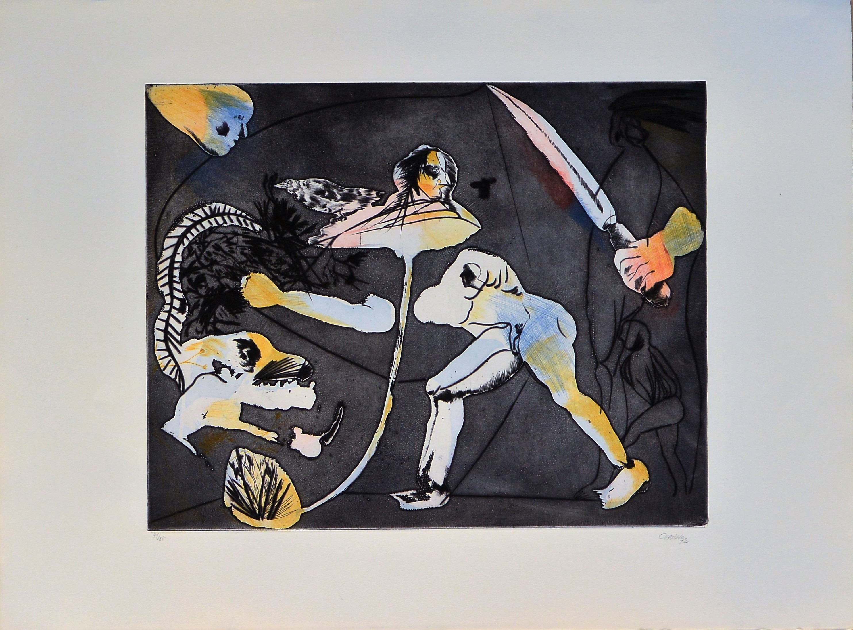 Jorge Castillo 1972, Españoles en América, grabado aguafuerte, edición 50 ejemplares, numerado y firmado a lápiz, plancha 39×49 cms. y papel 56,50×76 cms.