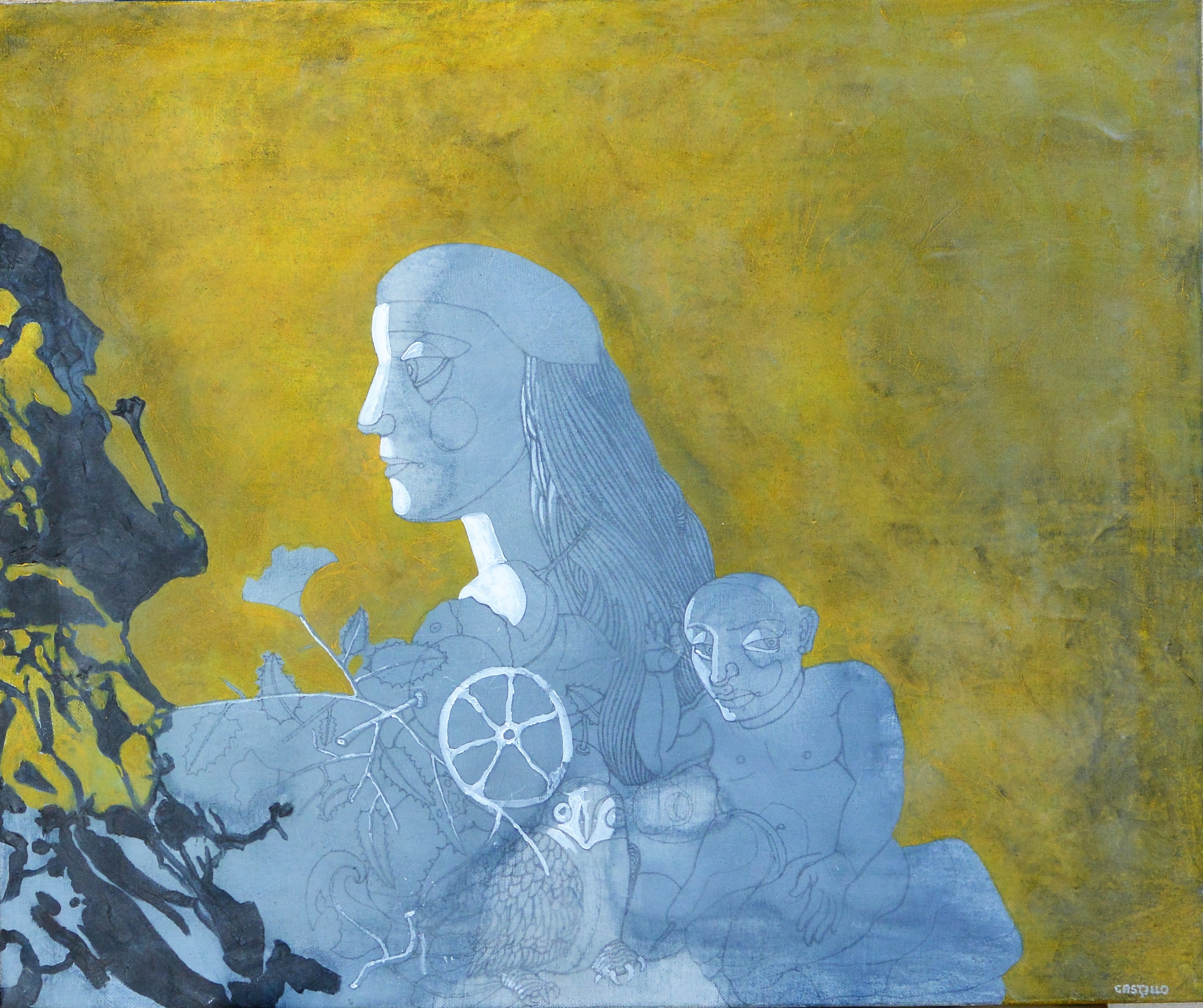Jorge Castillo 2002, Dos personajes con un buho, acrílico lienzo, 54×65 cms.