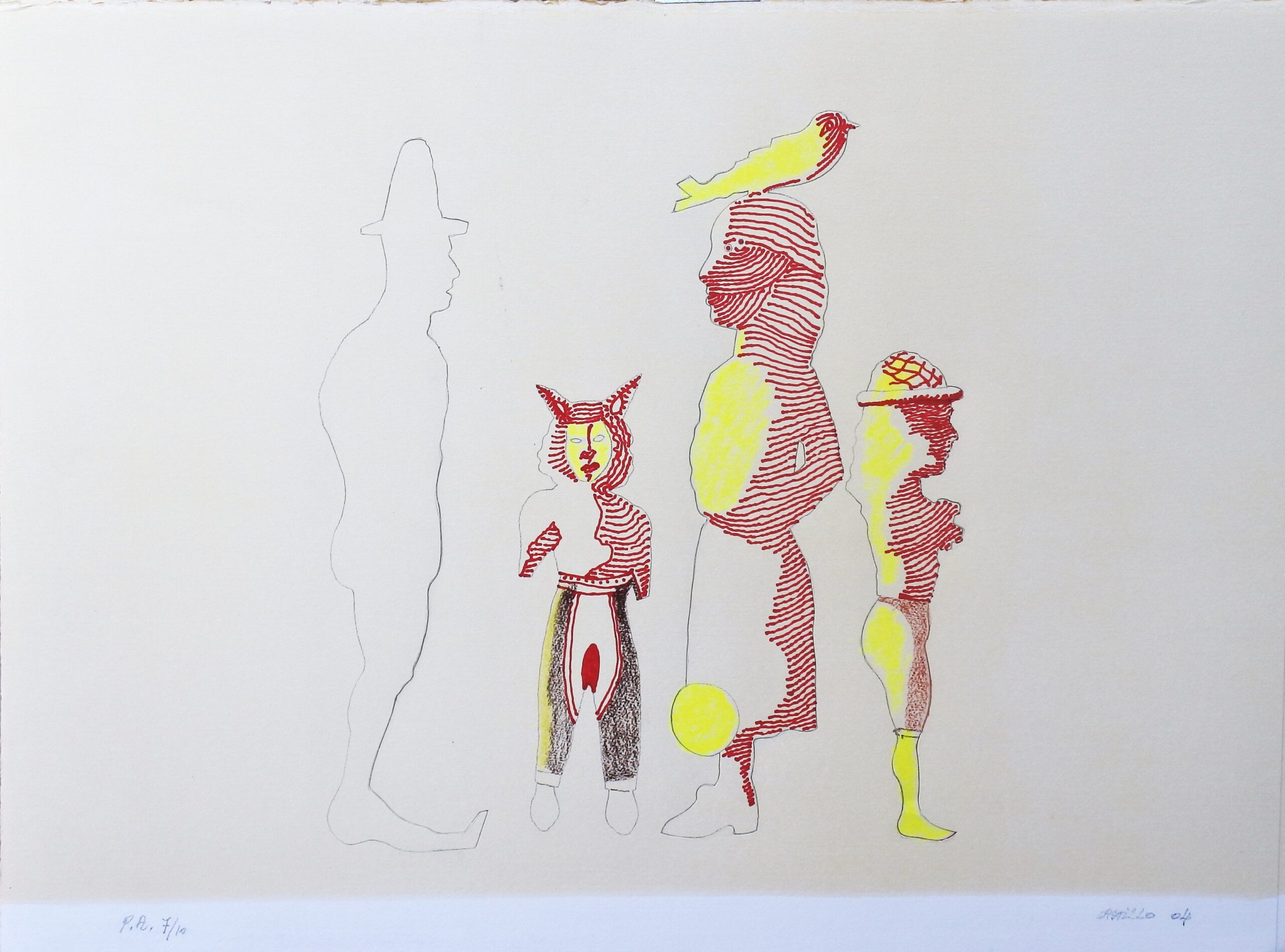 Jorge Castillo, Compañeros I, litografía troquelada y coloreada al Guache, numerada p,a,, datada y firmada a lápiz, 56×79 cms.
