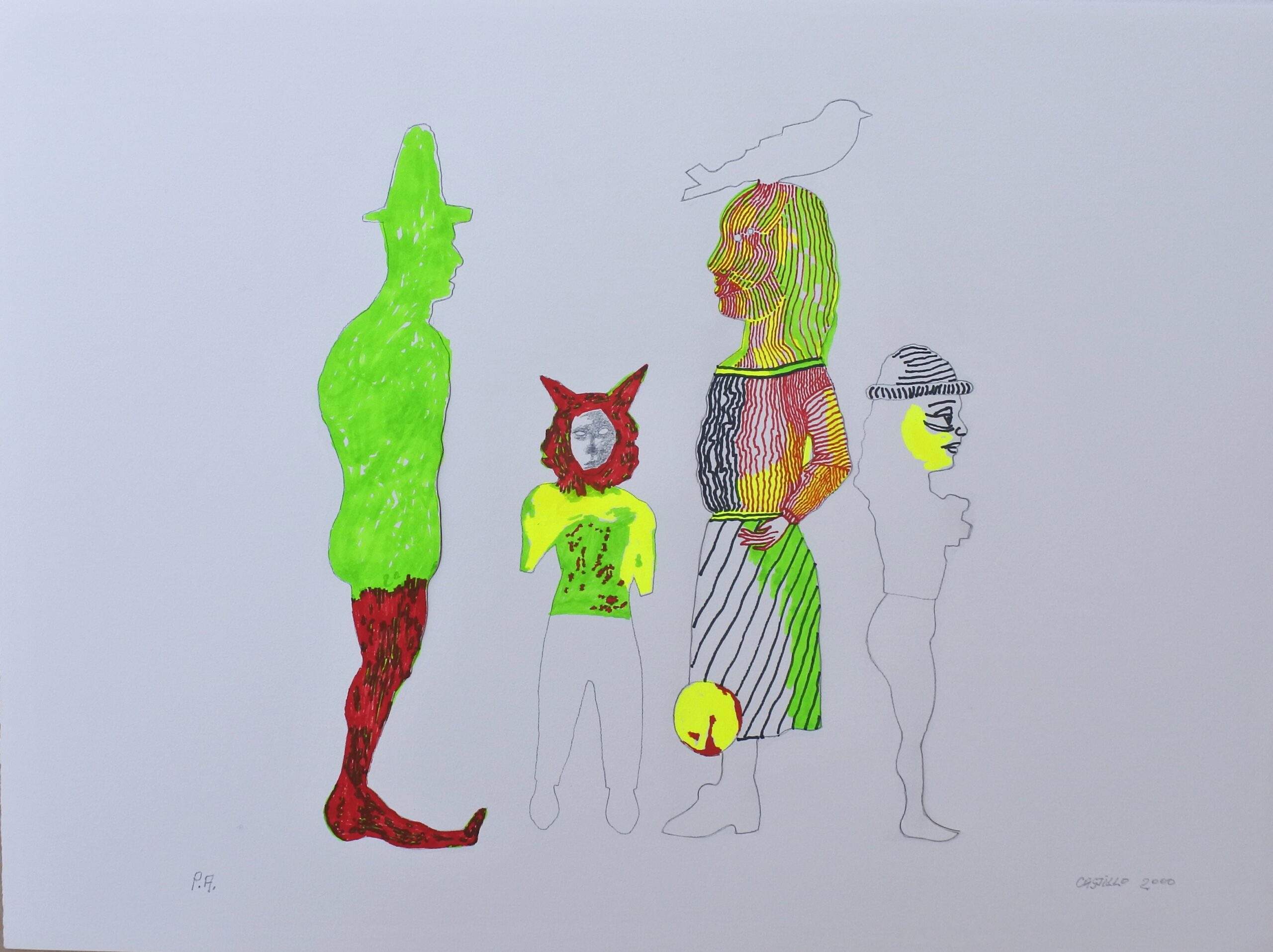 Jorge Castillo, Compañeros III, litografía troquelada y coloreada al guache por el artista, edición 25 ejemplares, numerado p.a. y firmado a lápiz, 56×79 cms.