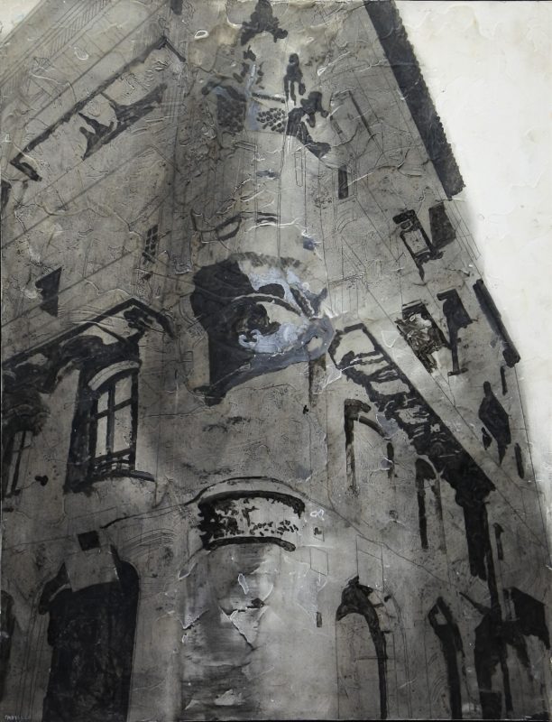 Jorge Castillo 2007 – «Vieja fachada en la Barcelona oscura» pintura acrílico y carboncillo sobre tela y madera, enmarcado