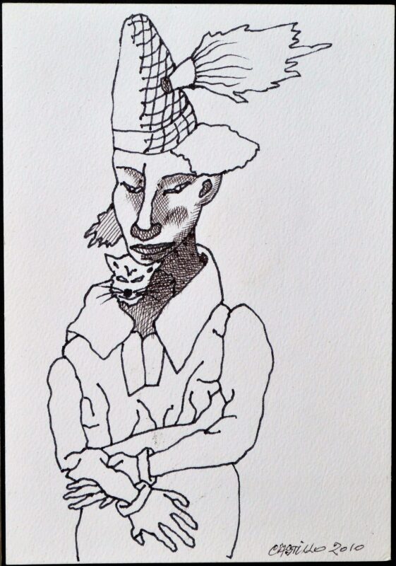 Jorge Castillo 2010, Arlequín del circo con su gato, dibujo tinta china cartulina, enmarcado, dibujo 18×12,50 cms. y marco 33×24 cms.