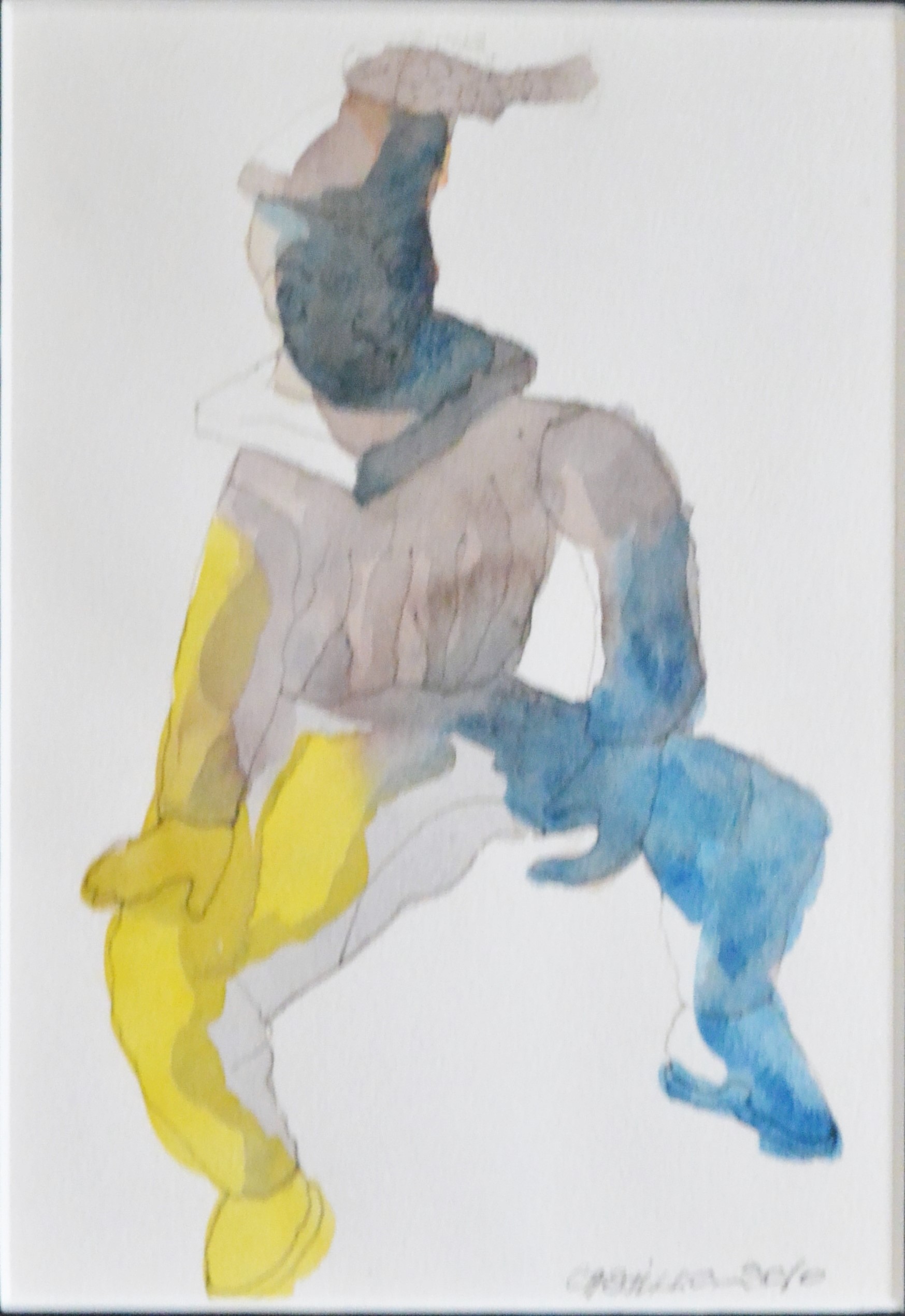 Jorge Castillo 2010, Arlequin sentado, dibujo acuarela cartulina, enmarcado, dibujo 18,50×12,50 y marco 43,50×40 cms.