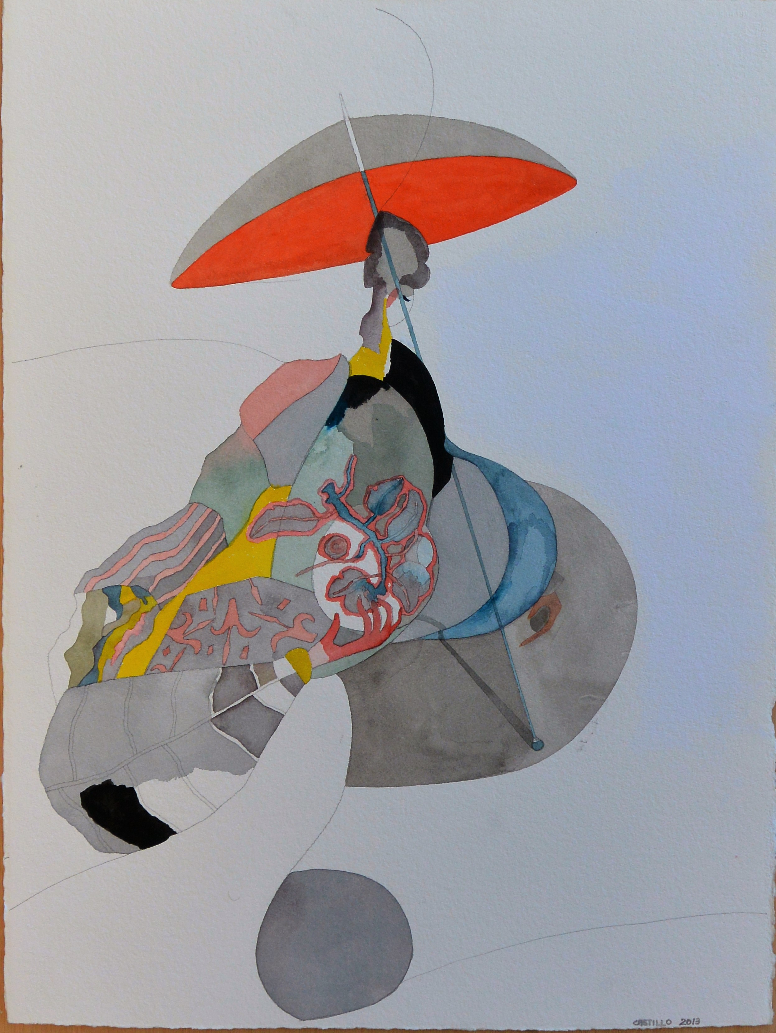 Jorge Castillo 2013, Geisha de la sombrilla, lápiz y acuarela papel artesanal, 77×58 cms.