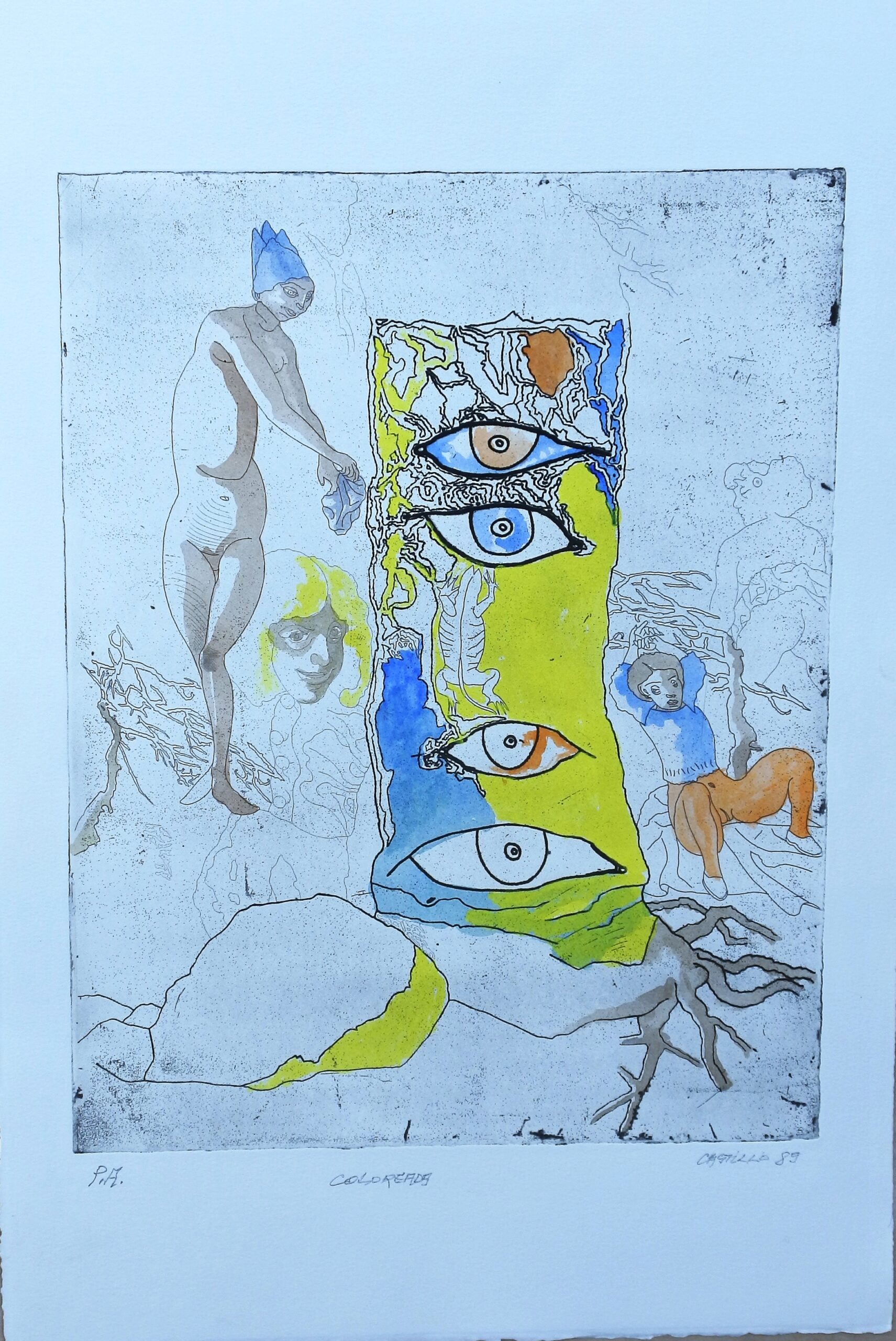 Jorge Castillo 89, Totem, grabado aguafuerte coloreado a mano por el artista, titulado, datado 89 y firmado a lápiz, plancha 43×33 cms y papel 60×40 cms.