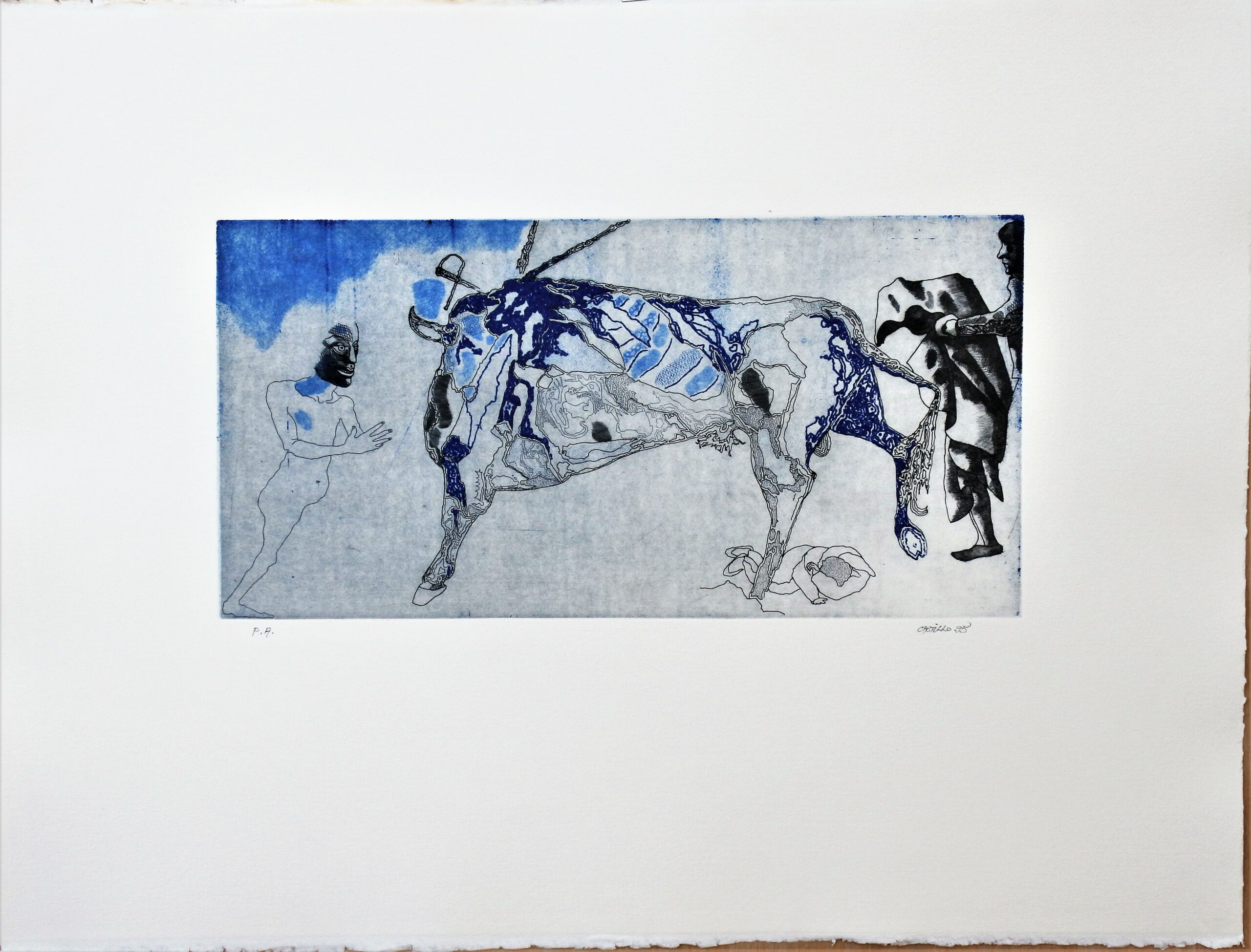 Jorge Castillo, Al quite, serie tauromaquia, grabado aguafuerte, edición 90 ejemplares, numerado p.a., datado 95 y firmado a lápiz, plancha 24,50×49 y papel 58×76 cms.