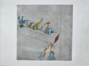 Jorge Castillo, Bodegón con búho, grabado aguafuerte, edición 60 ejemplares, numerado p.a. datado 03 y firmado a lápiz, plancha 49×49 cms. y papel 60×80 cms.