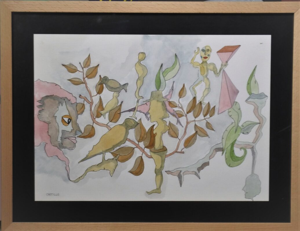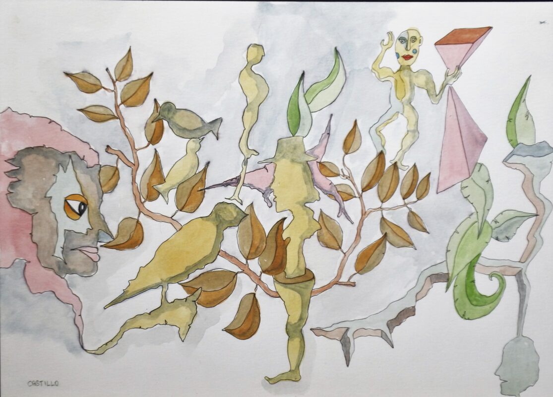 Jorge Castillo, Bosque animado II, dibujo tinta y acuarela papel, enmarcado, dibujo 29,50×42 y marco 41×54 cms.