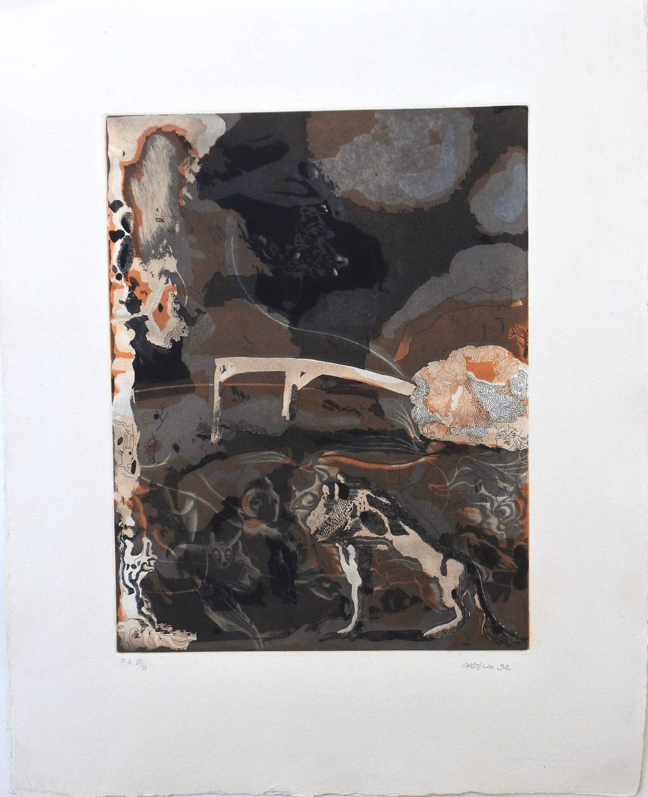 Jorge Castillo, Animales nocturnos, grabado aguafuerte y aguatinta, pertenece a la carpeta Cántico espiritual de San Juan de la Cruz, numerado y firmado a lapiz en 1994, plancha 42,50×32 y papel 79×61 cms.