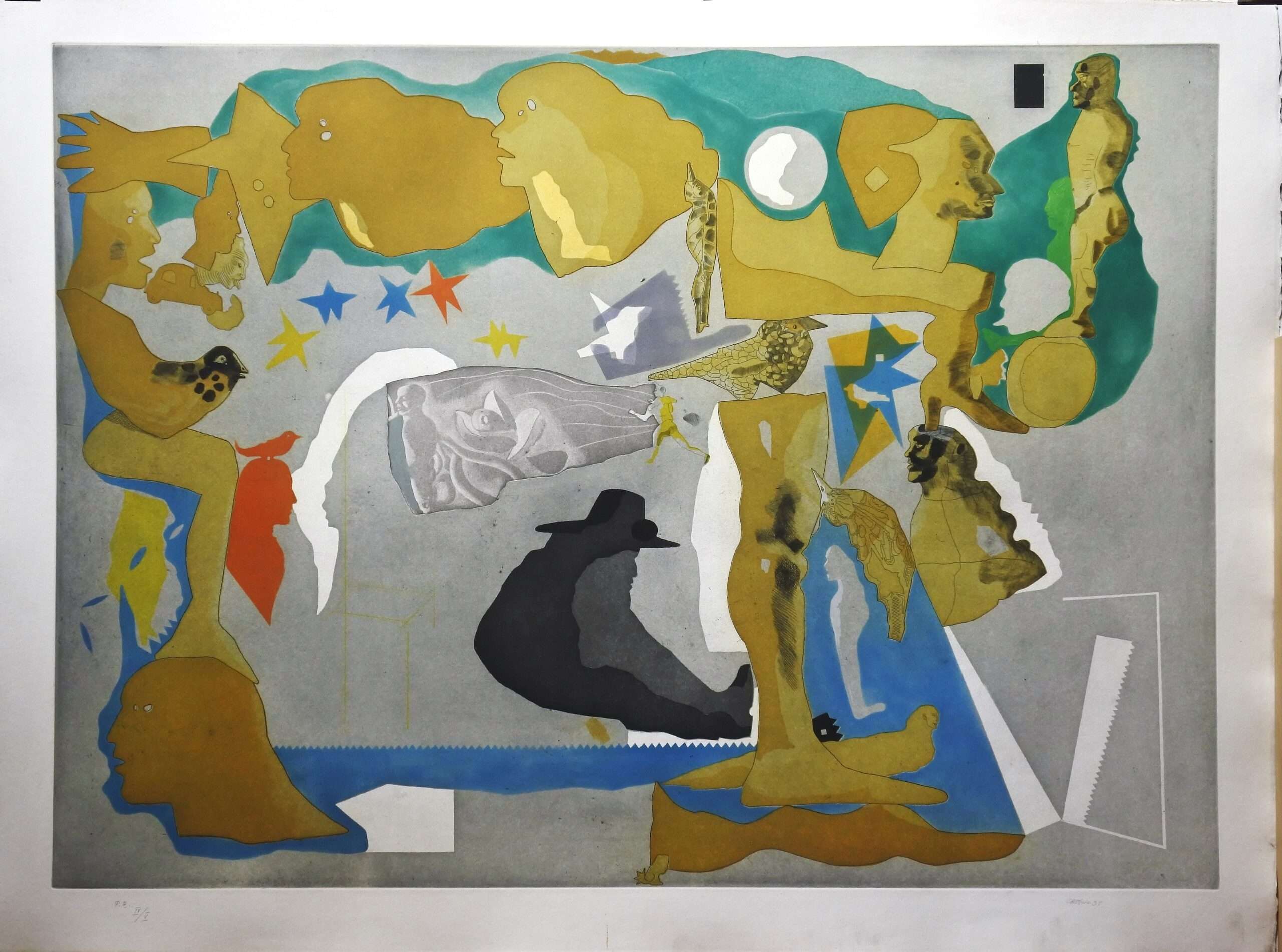 Jorge Castillo, El viejo en el parque, grabado aguafuerte iluminado a mano, gran formato, plancha 86×118 cms. y papel 98×130 cms.
