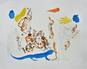 Jorge Castillo – «Grupo del circo con búho y reptil azul» grabado aguafuerte